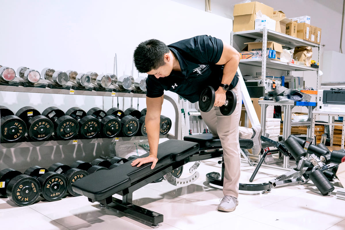 ダンベルローイングでは、ベンチにつく手の位置や足の幅が非常に重要で、これが乱れた状態だと自然と姿勢も崩れてしまいます。最初は軽いおもりからスタートして、正しいポジションや動きを取ることから始めてみましょう。