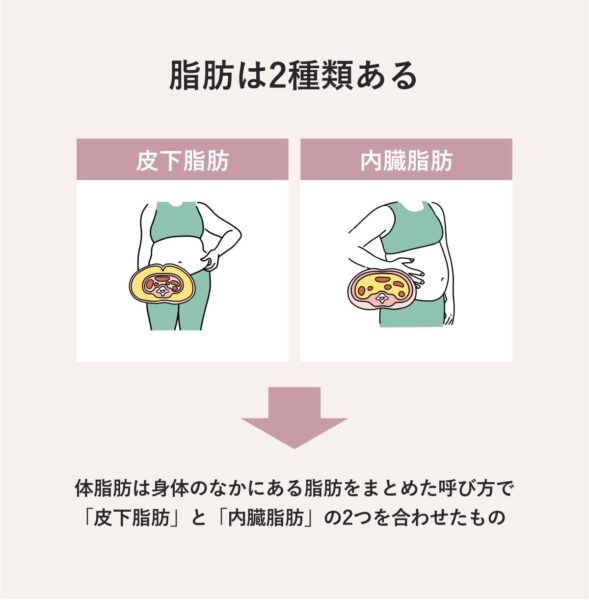 体脂肪とは、身体のなかにある脂肪をまとめた呼び方で、 「皮下脂肪」と「内臓脂肪」の2つを合わせたもの。