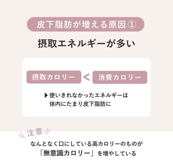 皮下脂肪が増える一番の理由は、摂取したエネルギー量が、消費エネルギー量より多いこと。使いきれなかったエネルギーは、体内にたまり、皮下脂肪となっていく。