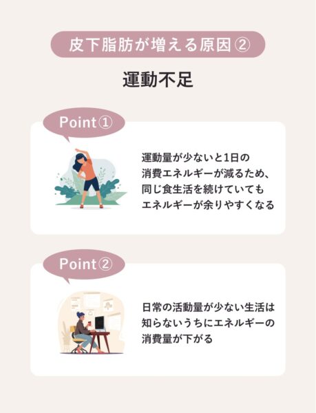 運動不足も、皮下脂肪が増えてしまう大きな原因。