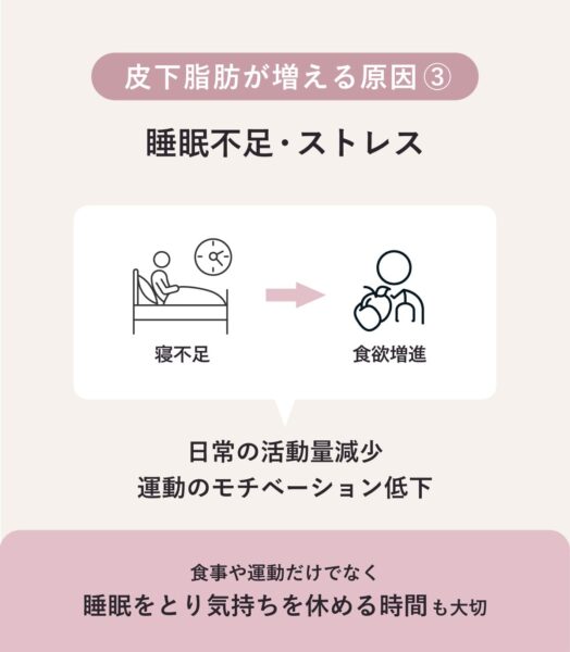 寝不足やストレスも、皮下脂肪がつきやすくなる原因。