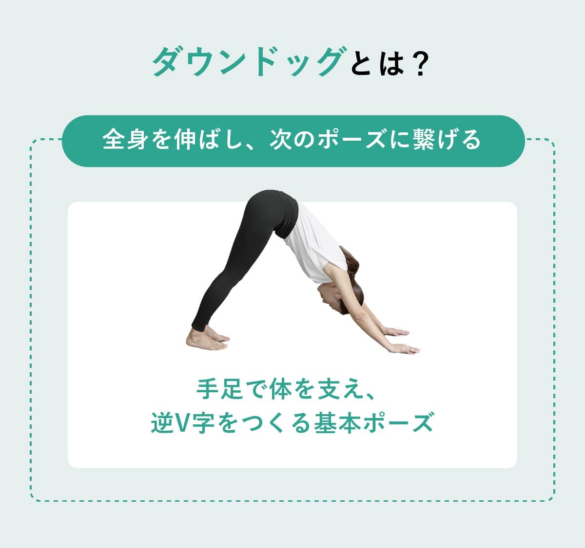 ダウンドッグは、手足で身体を支え逆V字を作るヨガの基本ポーズの1つ。「下向きの犬のポーズ」「アド・ムカ・シュヴァナーサナ」とも呼ばれる。ほぼすべてのヨガのクラスに登場し、呼吸を整えながら全身をリセットし次の動作へつなぐ役割を担う。ヨガの代表的な一連のポーズである「太陽礼拝」中にも含まれ、ポーズの繋ぎにダウンドッグが何度も出てくる。