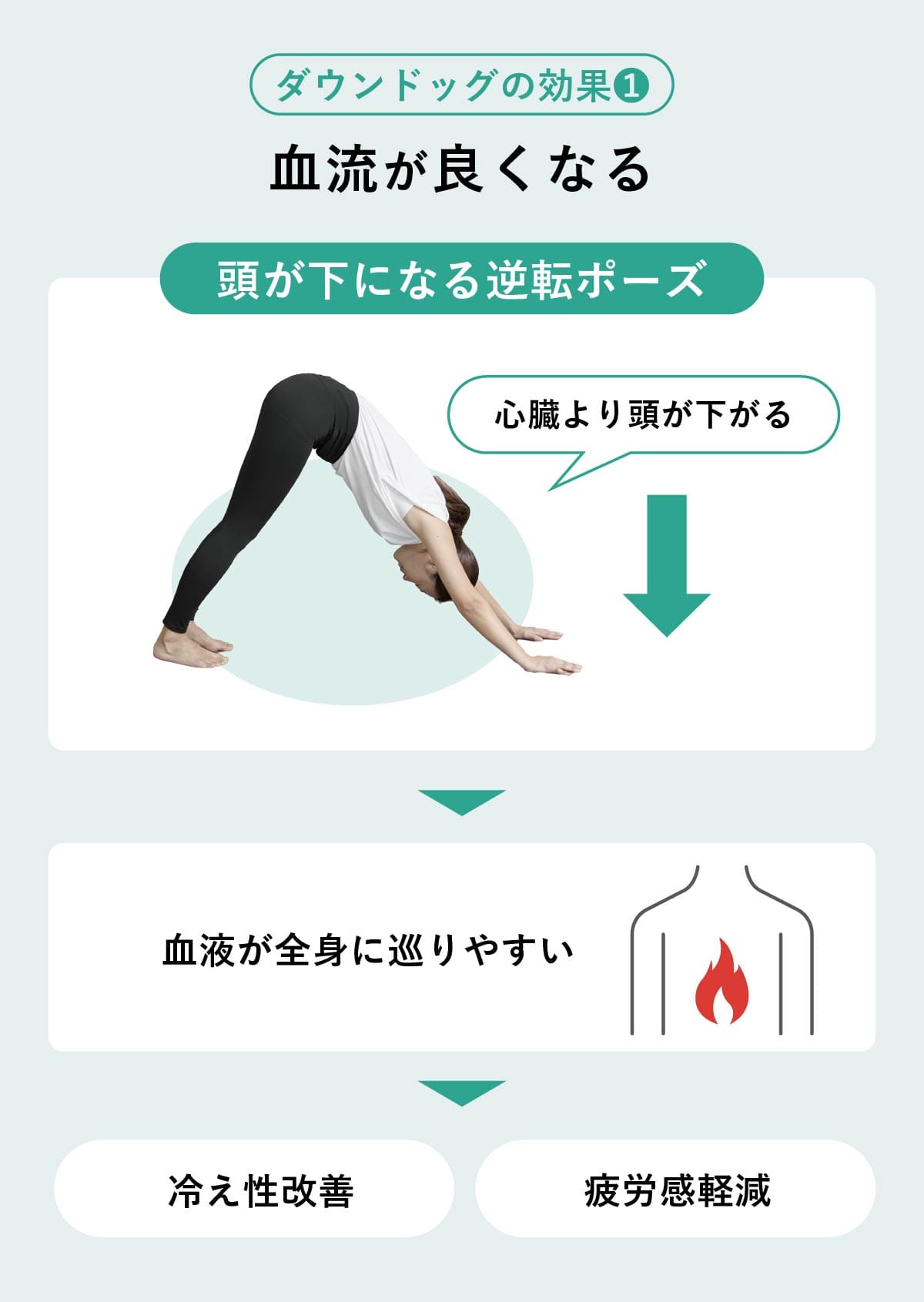 ダウンドッグは「逆転のポーズ」と言われており、頭が下になるポーズ。心臓より頭が下がるため、全身の血行が促されやすくなる。血流が良くなると冷えや疲労感の軽減などに繋がる。