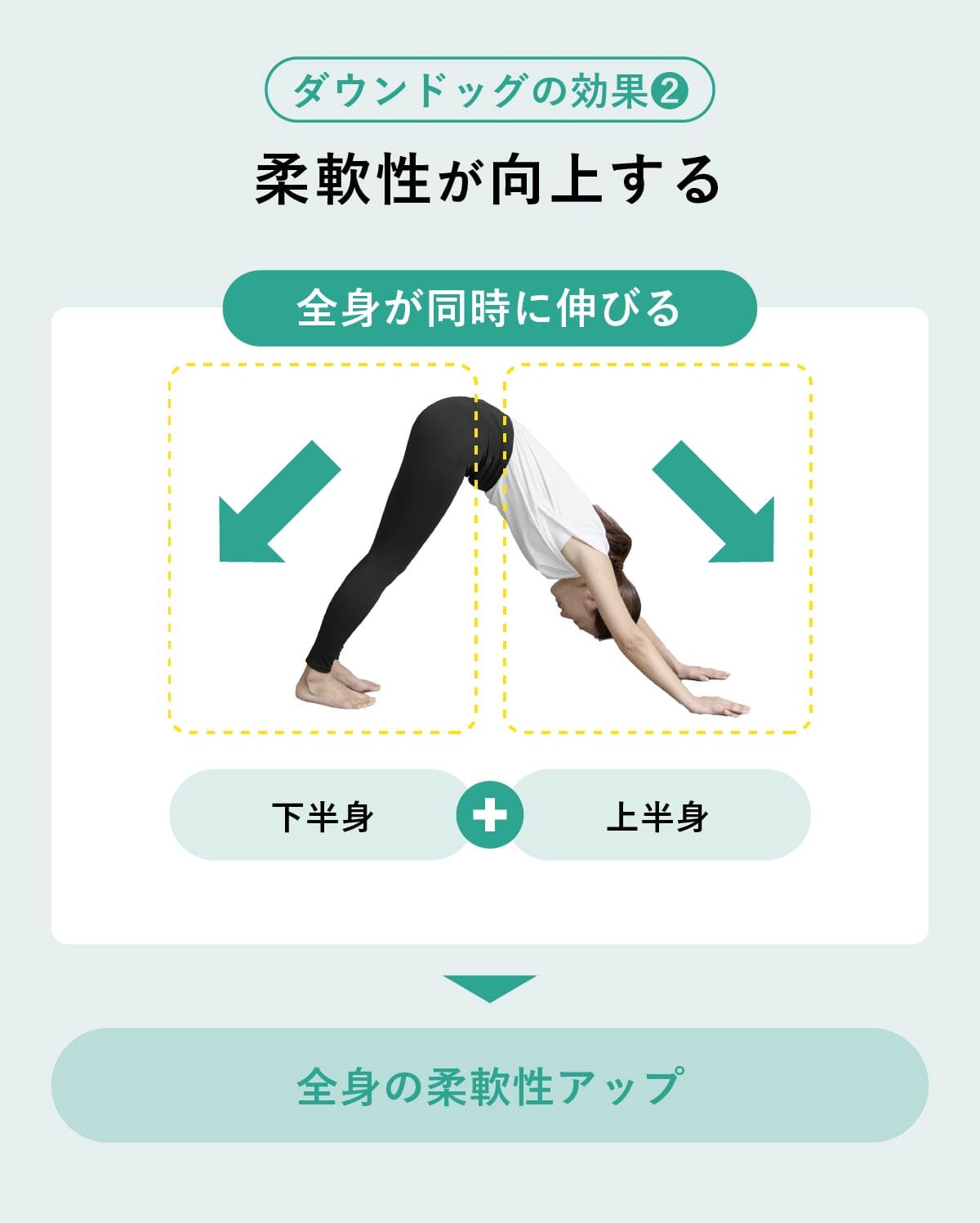 ダウンドッグは上半身も下半身も一度に伸ばせるため、全身の柔軟性向上に繋がる。ストレッチ効果もあり、効率よく身体をゆるめることができ、他のヨガポーズへの移行もスムーズにできる。