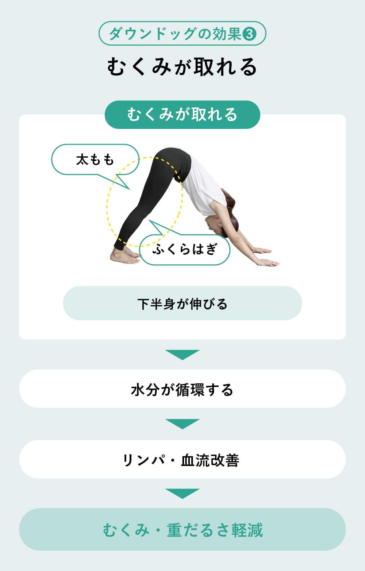 ダウンドッグはふくらはぎや太ももを伸ばすため、下半身に滞りがちな水分の循環を助け、リンパや血液の流れを促進する。脚の重だるさやむくみ対策に効果的。1日の終わりに取り入れるのがおすすめ。