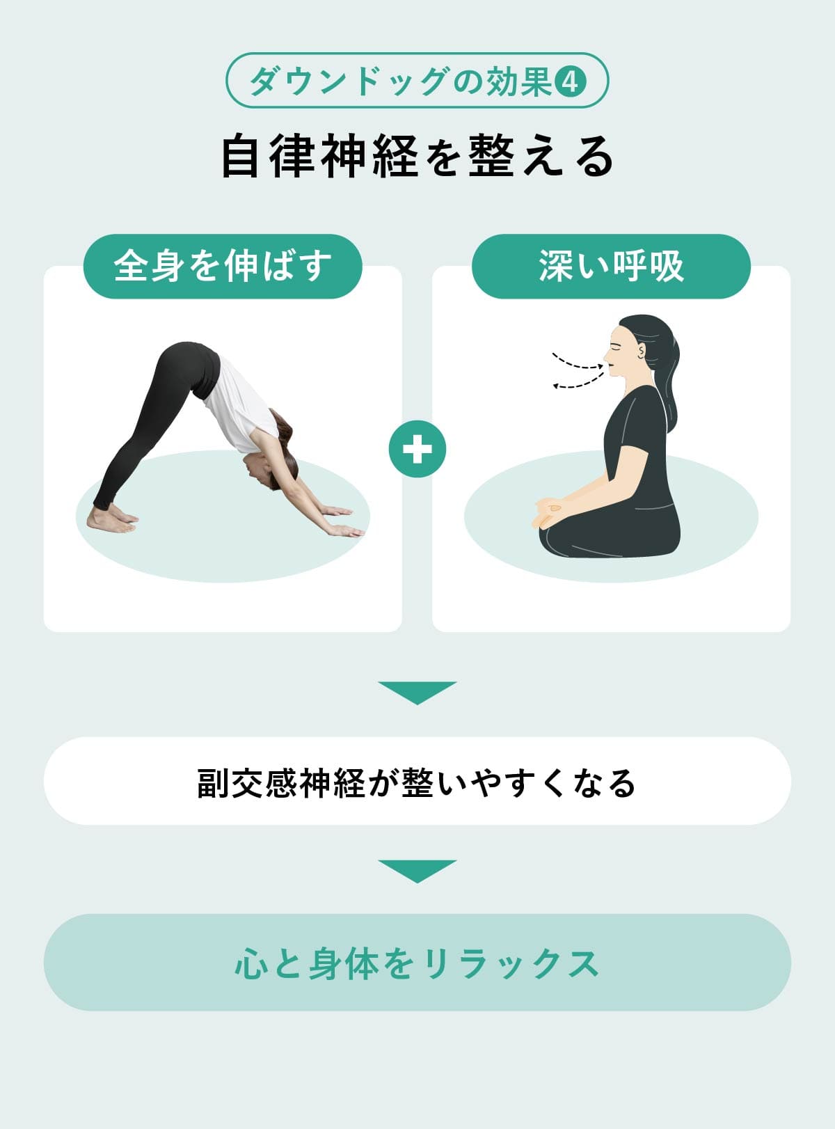 呼吸と動作を連動させやすいダウンドッグは、心身を落ち着かせられる。全身を伸ばしながら深い呼吸を行うことで、副交感神経が優位になりやすい。身体だけでなく心の緊張をゆるめるポーズとして、日常のリセットにも役立つ。