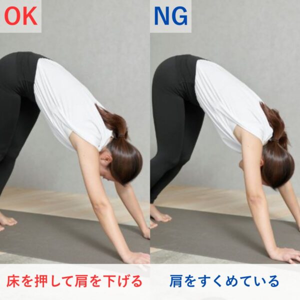 つい肩がすくみがちになってしまいますが、それだと呼吸がしづらく動きが固くなりがちに。床を両手でしっかり押すことで、肩が下がり、お尻を上げやすくなりました。