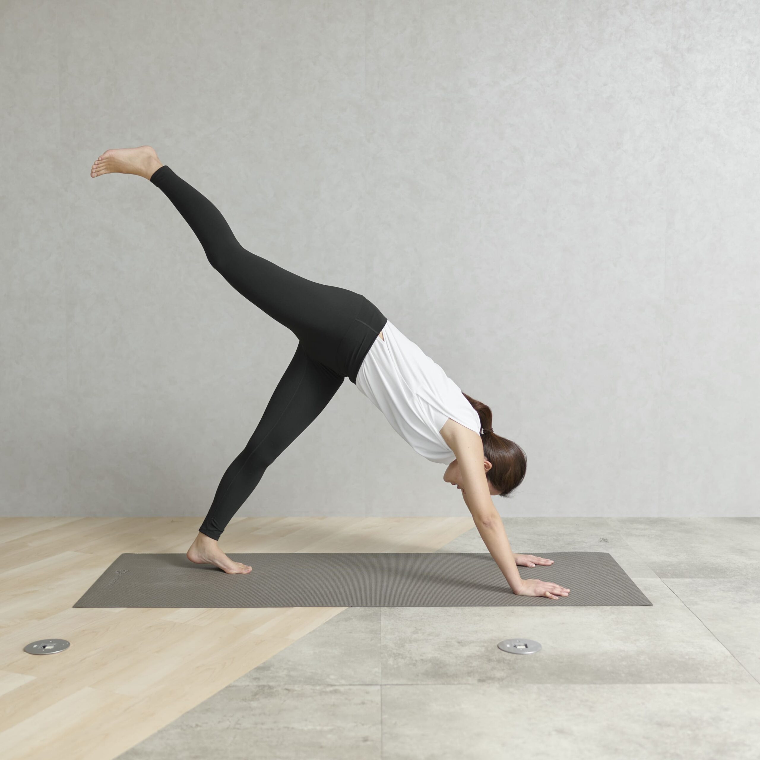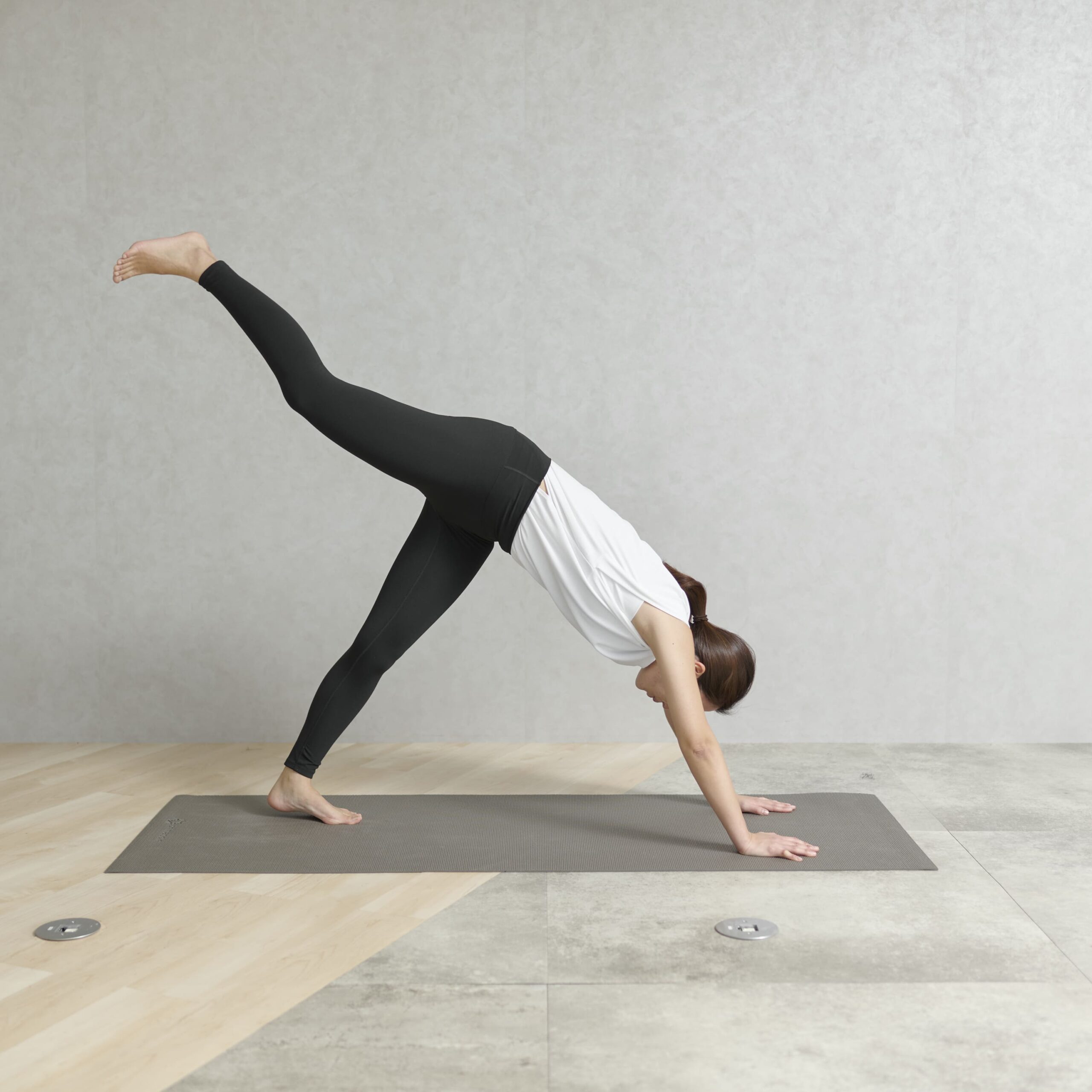 片足を上げたダウンドッグは、お尻の筋肉の強化に効果的です。また、3点で支えることから、お尻だけでなく腹筋など体幹の強化にもつながります。