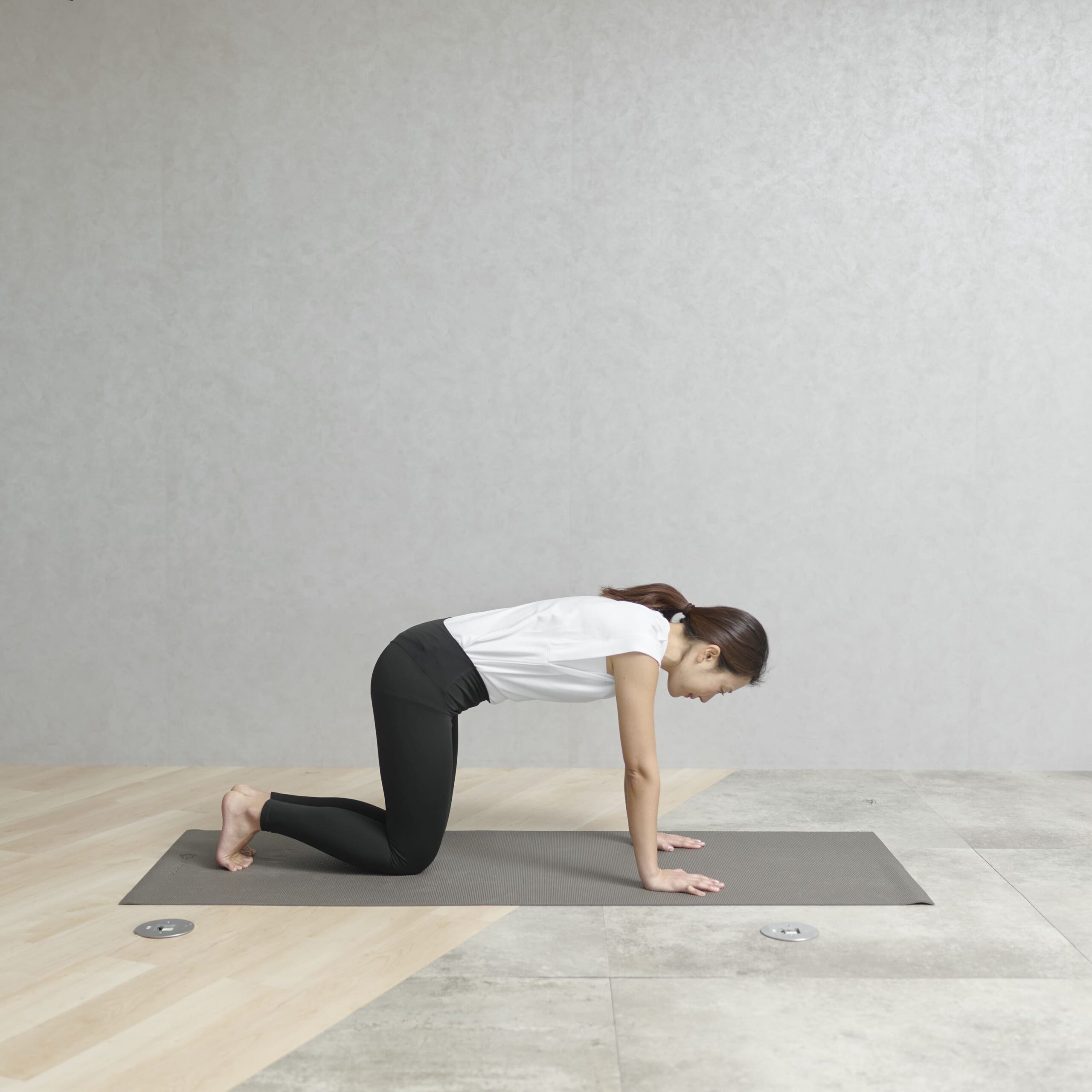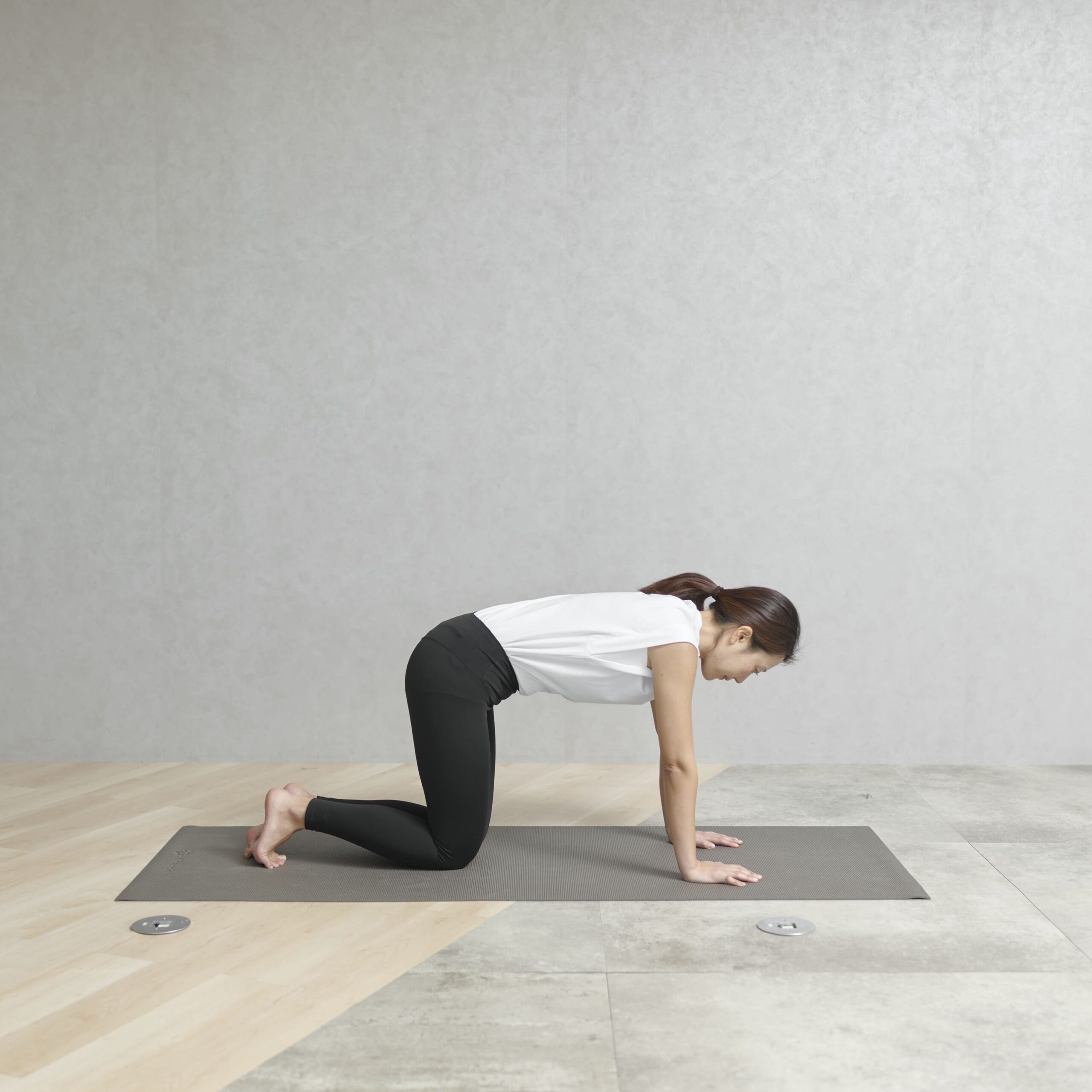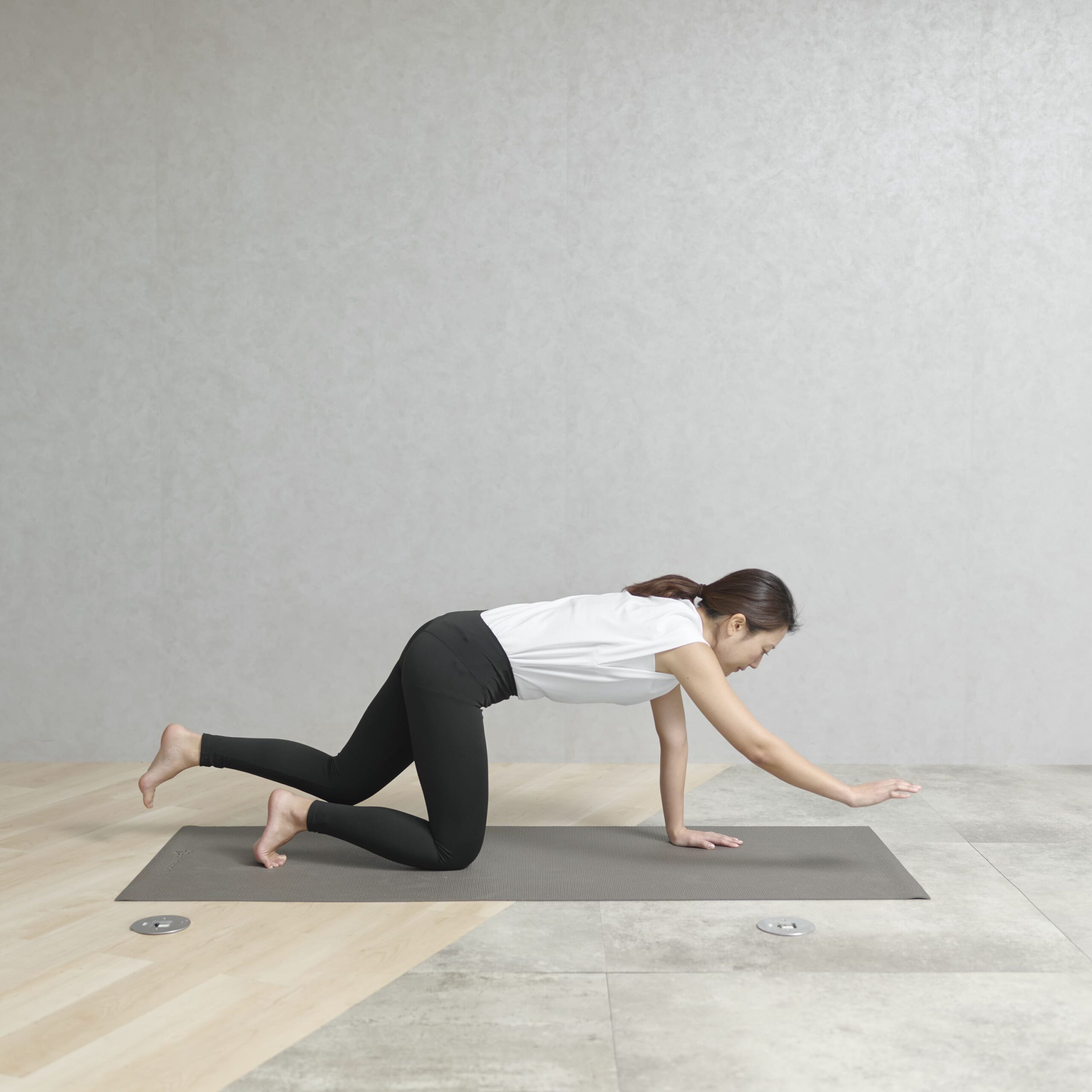 - 息を吐きながら背中を丸め、右肘と左膝を曲げ、近づける(キャット)