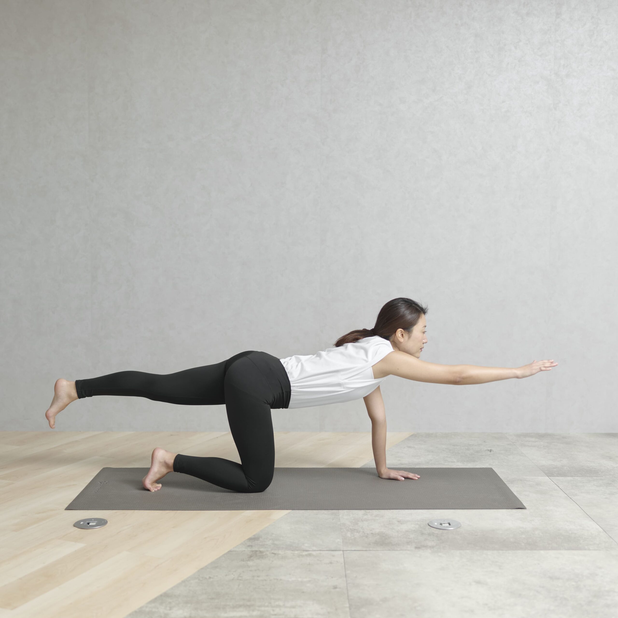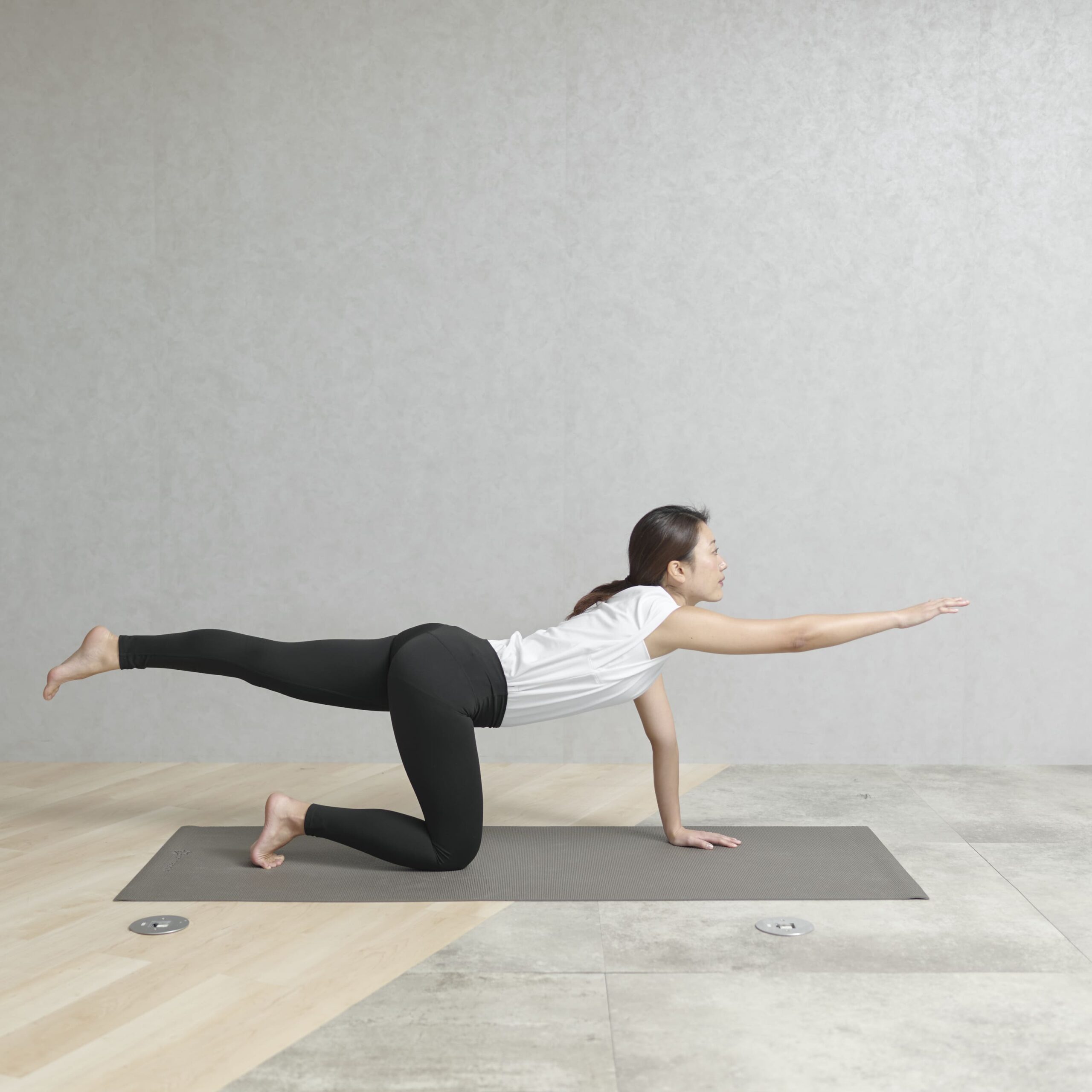 - 息を吸いながら右手を肩の高さ、左脚をお尻の高さにあげる