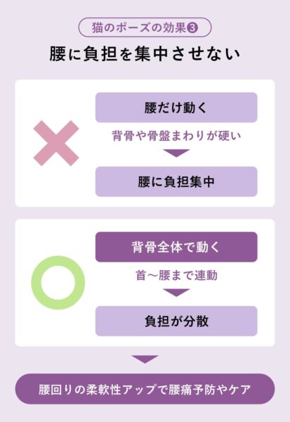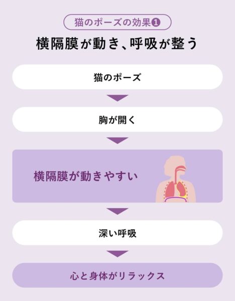 ヨガは呼吸ができる体作りが目的の一つ。呼吸は横隔膜で行っているため、猫背で横隔膜の動きが悪ければ呼吸がしづらくなる。猫のポーズのように背骨をたくさん動かすことで、横隔膜の角度が整いやすくなり、自然と呼吸しやすくなる。呼吸が深まれば自律神経やメンタルが整い、リラックスすることができる。