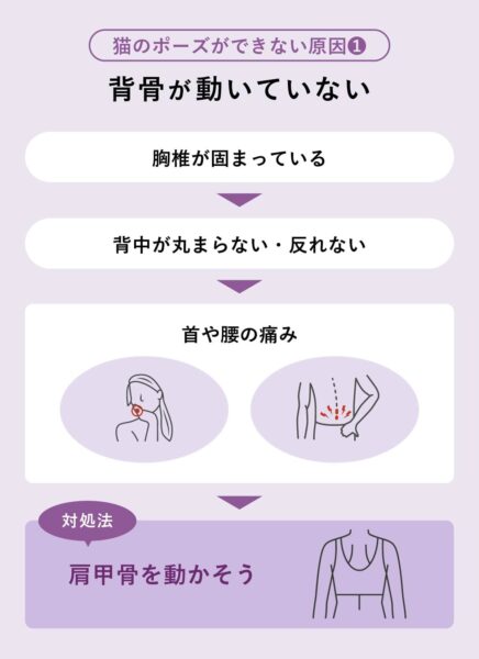 猫のポーズができない原因は、背骨が硬いこと。首や腰が痛い理由は、背骨の胸椎が動かないことが原因。肩甲骨を動かす運動をするのが1つの対処法。