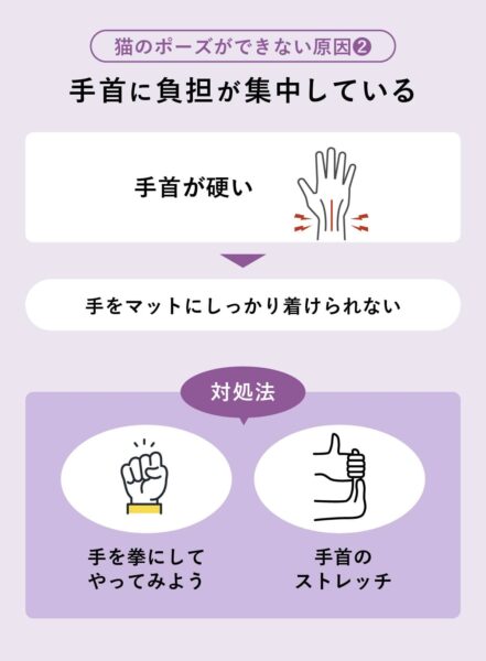 手首が硬い人は四つん這いになった時に手のひらは中央を浮かせず、指の付け根から指先までマットに密着させて手をつくことができない。痛いときは手を拳にして行うとよい。拳を床につくスタイルにすることで、手首が曲がらないポジションでポーズを取れる。