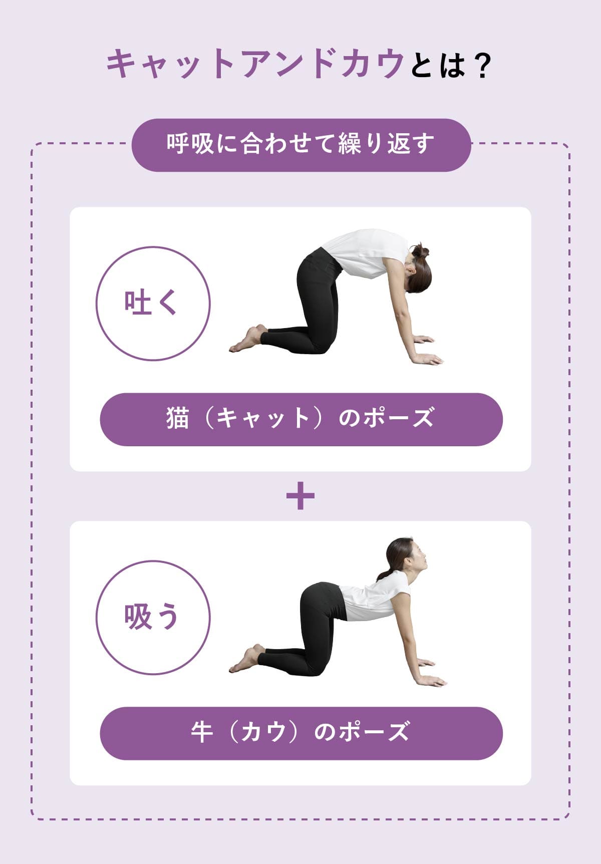 キャットアンドカウは、四つん這いの姿勢から背骨を丸める「猫のポーズ(キャットポーズ)」と、背中を反らせて胸を開く「牛のポーズ(カウポーズ)」を呼吸に合わせて繰り返すヨガの動き。猫の丸まる動きと、牛の背中が反った姿をイメージした動きから、キャットアンドカウと呼ばれている。静止するポーズとは異なり、呼吸と連動した連続的な動きが特徴となる。猫のポーズと牛のポーズを一緒に行うことが多いが、必ずしも一緒に行う必要はなく、別々に行っても良い。