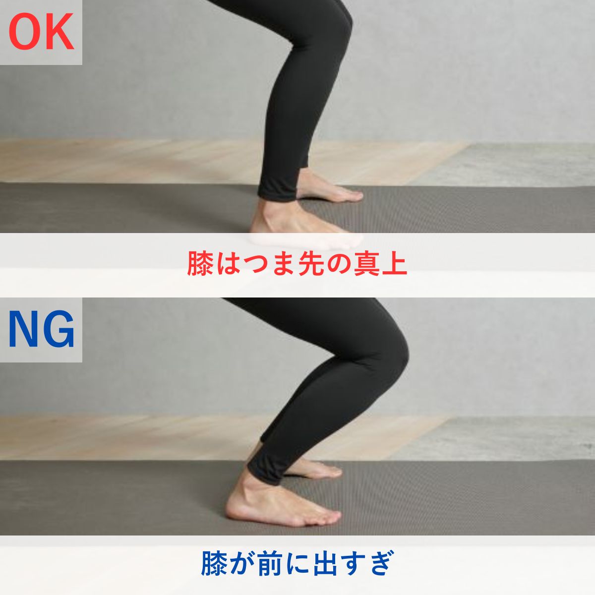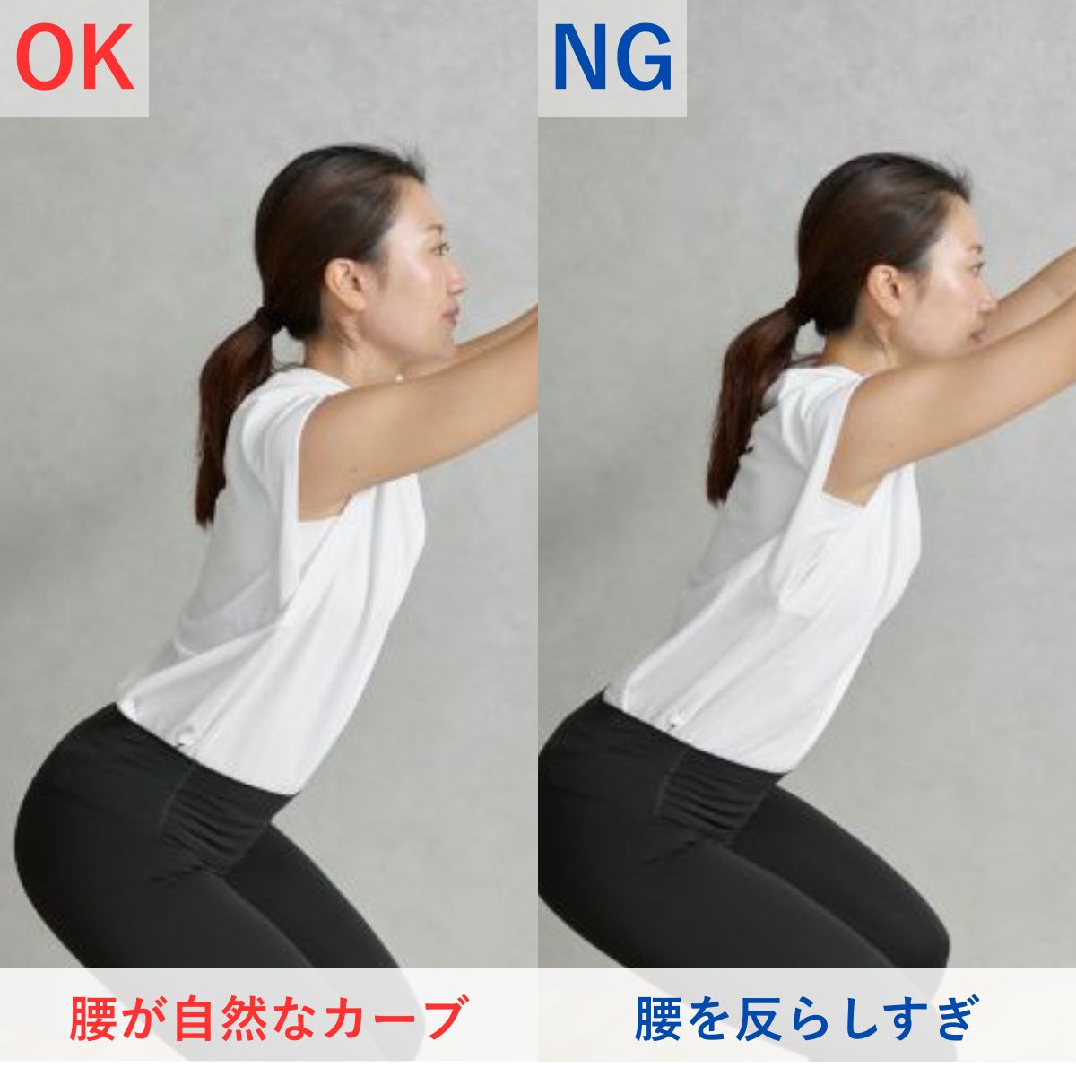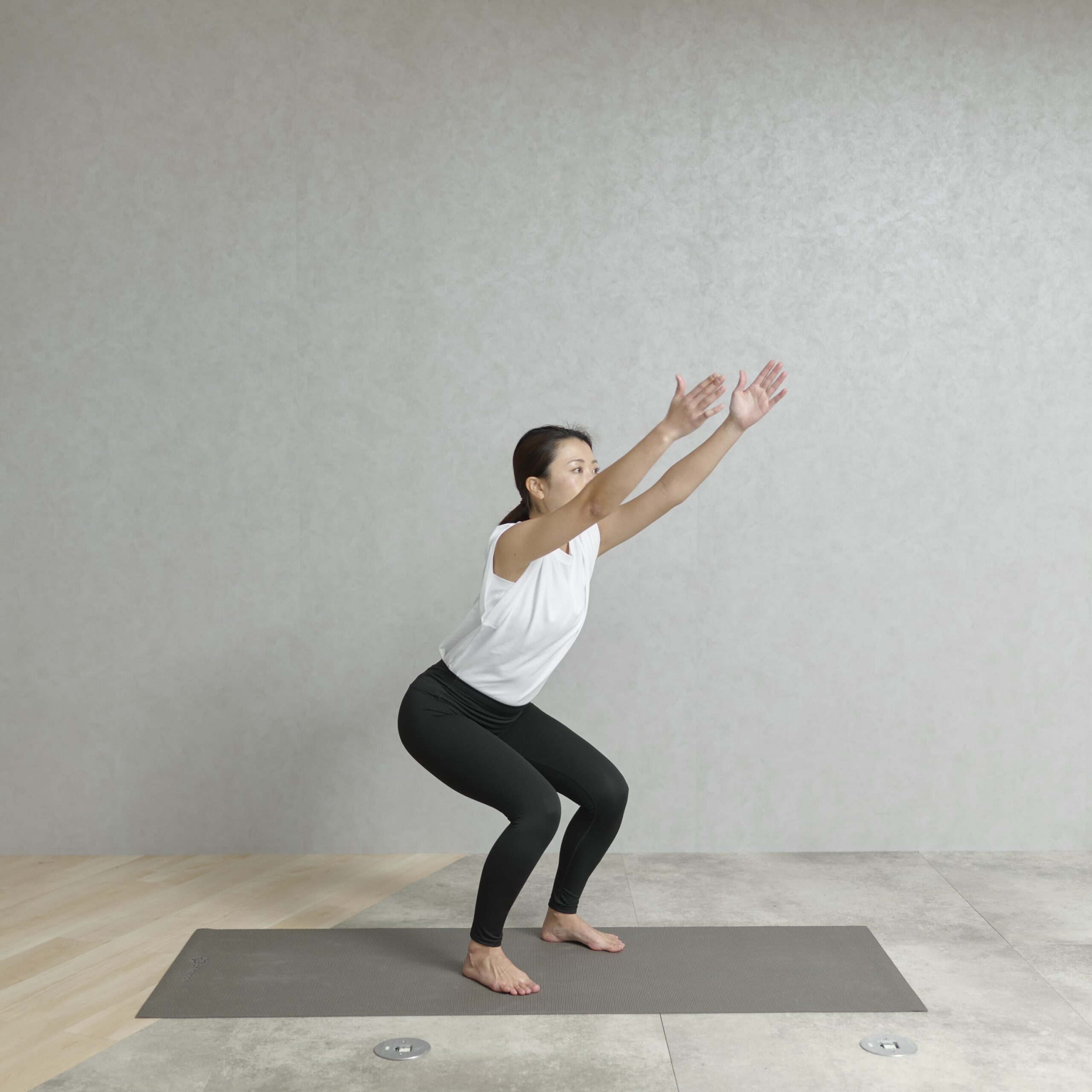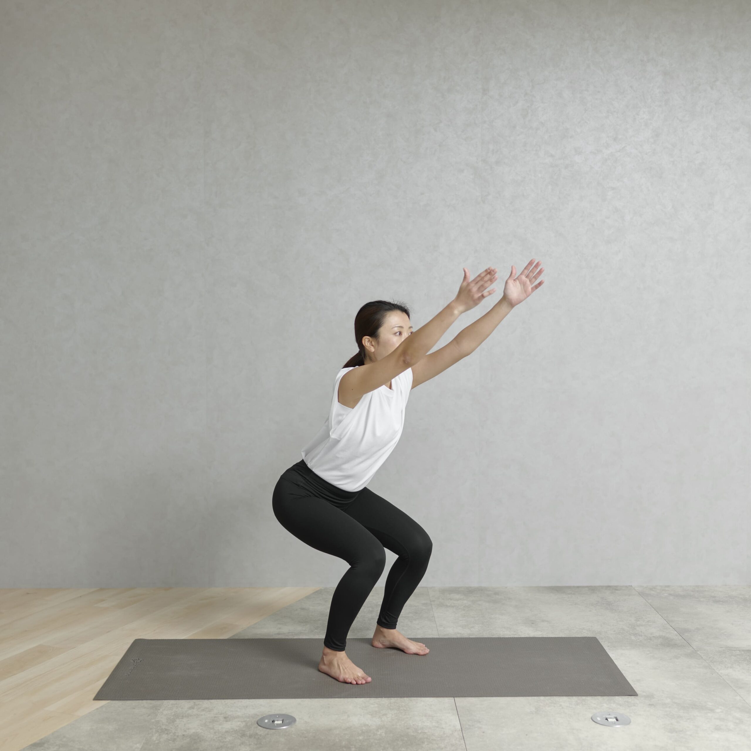 - 息を吐きながらお尻を後ろへ引き、椅子に座るように膝を曲げる