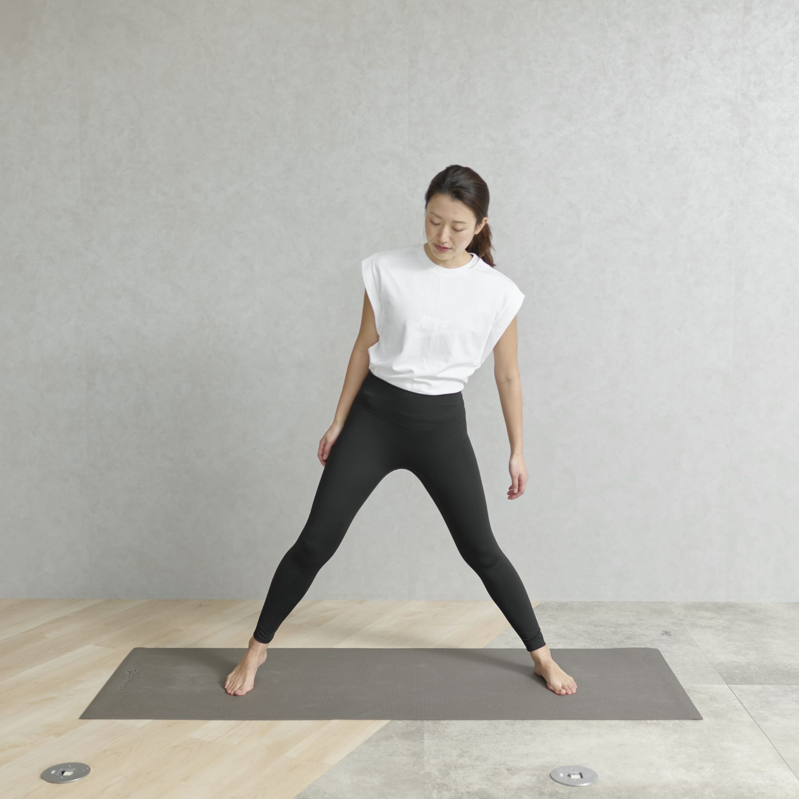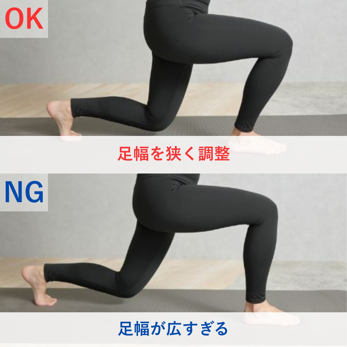 - 右の爪先を正面に向け、左足を少し内側に向ける