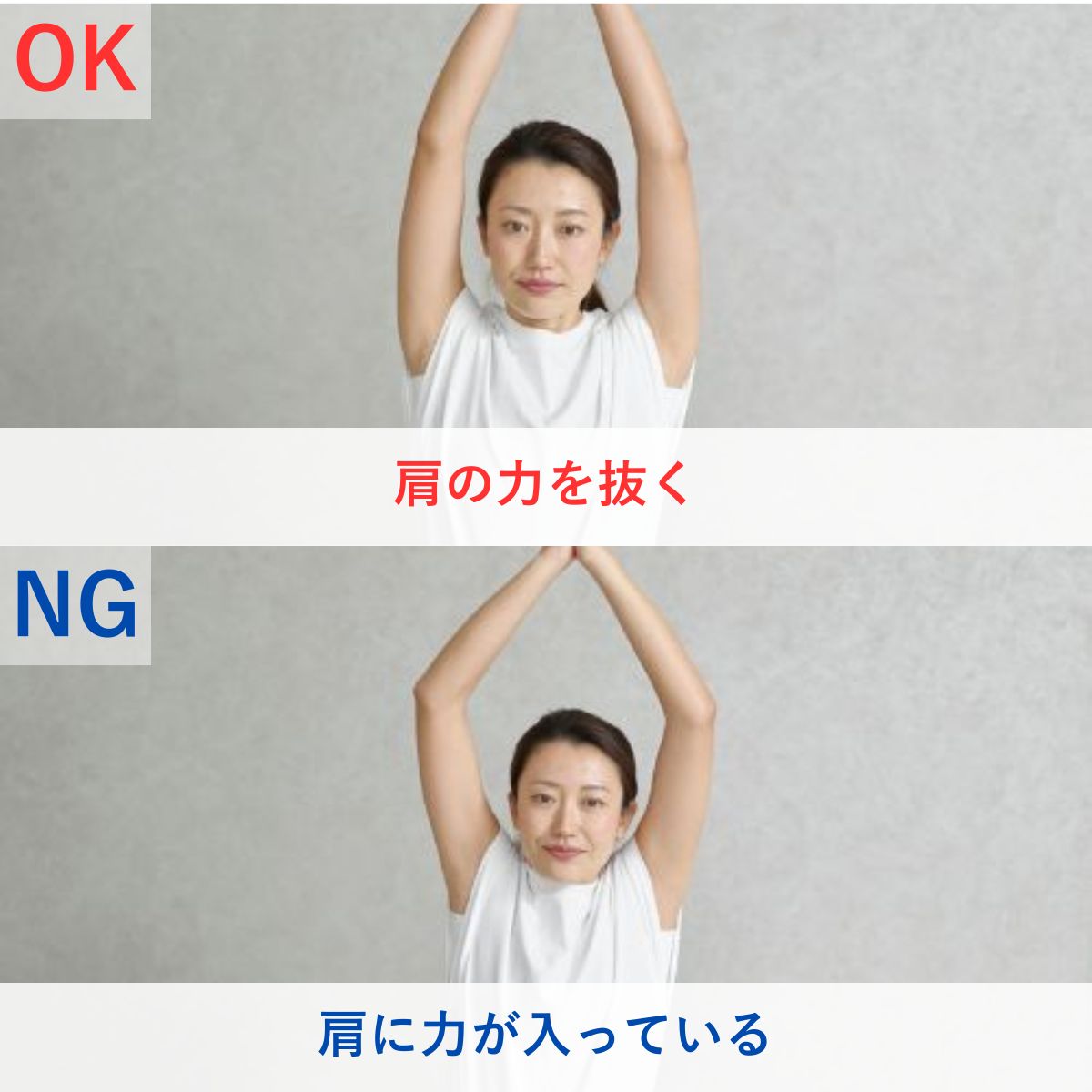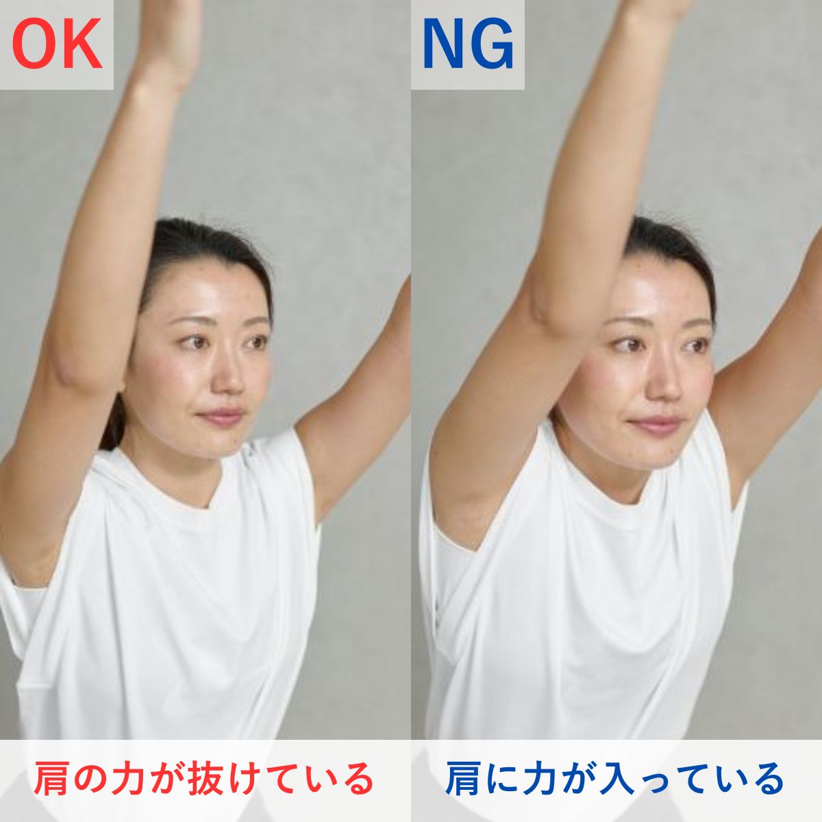 また、肩を落としながら腕を上げていく動作をするので、肩こりを取りやすい人にも効果的です。