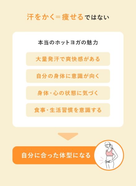 ヨガは最終的にその人にとってのベストな体型になる。痩せやすくするためには自分の身体の声を聞くことが何より重要。ヨガを続けていくことで、自分の身体をよく見るようになり、自分の身体の状態や心の状態を把握できるようになる。意識が変わり、食生活や運動習慣が見直され、結果的に痩せやすくなる。