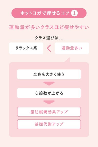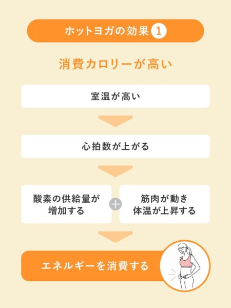 さらに、温かい環境下で行うことで筋肉がほぐれやすく、可動域が広がるため、より深くポーズを取れる。その結果、筋肉への刺激が高まり、効率よく代謝アップを目指せる。