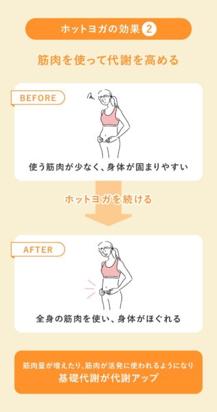 ホットヨガのポーズは、身体を支えたりバランスを取ったりする動きが多く、インナーマッスルを含む全身の筋肉を継続的に使う。筋肉量が増えたり、筋肉が活発に使われるようになると、安静時でもエネルギーを消費しやすくなり、基礎代謝の向上につながる。