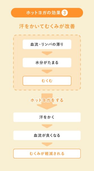 大量に汗をかくことで余分な水分が排出されやすく、むくみ解消に繋がる。むくみは、血液やリンパの流れが滞り、水分がたまることで起こる。身体を動かしたり温めたりして汗をかくと血流が良くなり、たまっていた水分が血管の中に戻りやすなる結果、身体がすっきりした感覚になる。また、汗と一緒に水分や塩分が身体の外に出ることで、体内の水分バランスが一時的に整う。