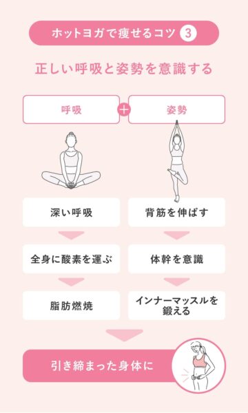 ポーズだけを真似するのではなく、呼吸と姿勢をセットで意識することが重要。深くゆったりとした呼吸を行うことで酸素が体内に行き渡り、脂肪燃焼が促される。また、背筋を伸ばし体幹を意識することで、インナーマッスルが鍛えられ、引き締まったボディラインにつながる。