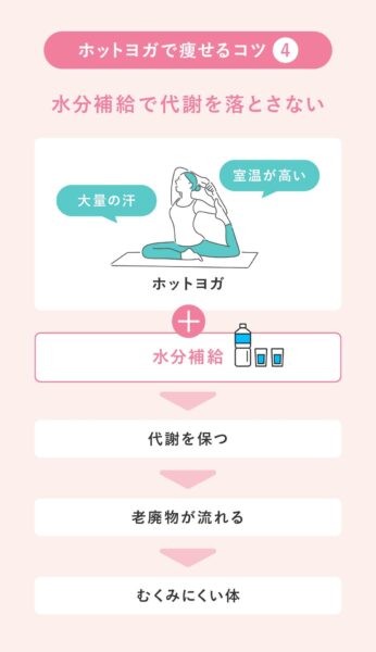 ホットヨガでは大量の汗をかくため、こまめな水分補給が必須。水分が不足すると代謝が落ち、疲労感も強くなってしまう。レッスン中・前後に少しずつ水を飲むことで、老廃物の排出がスムーズになり、むくみ対策や痩せやすい体質づくりにも効果的。