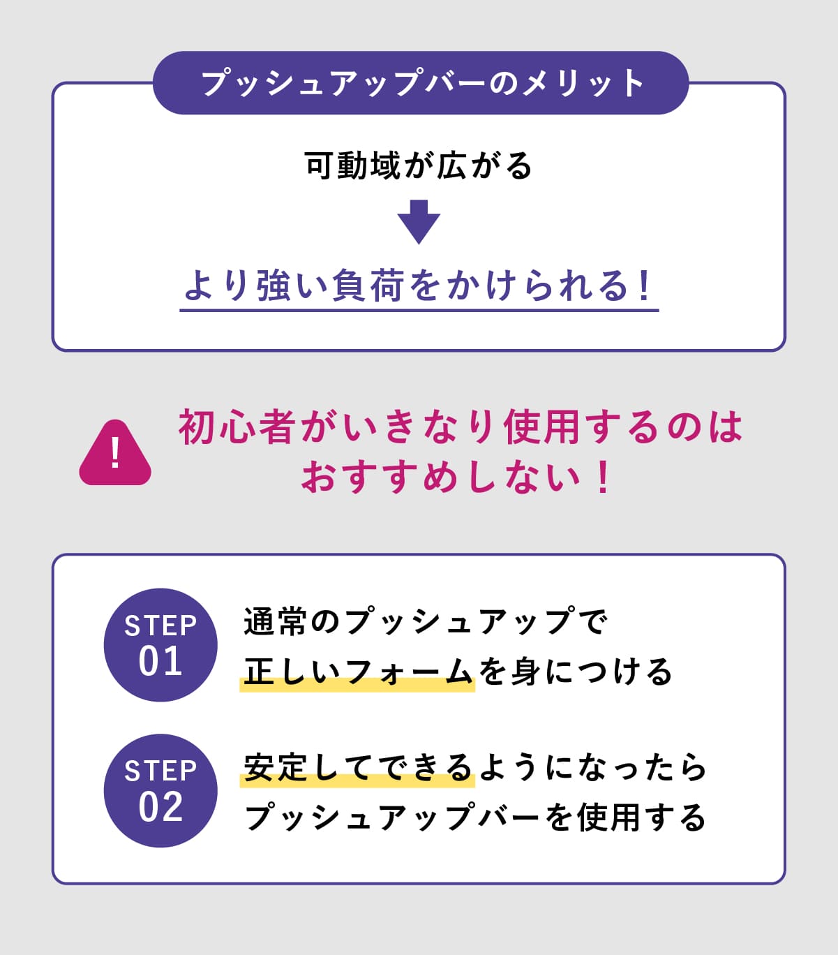 ただし、初心者がいきなり使うと手首や肩を痛めやすいので、まずは床でのプッシュアップを安定してできるようになってから使うことが重要。