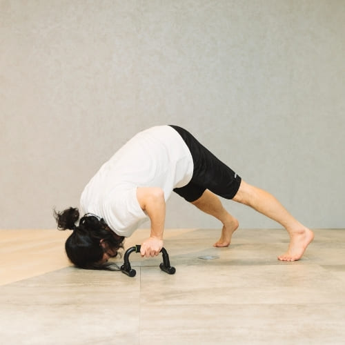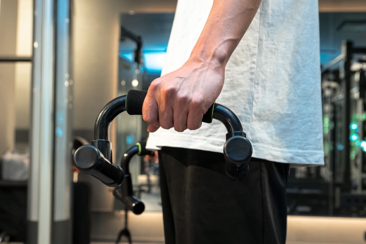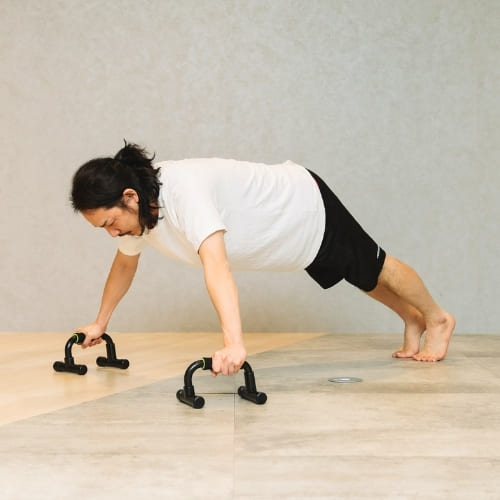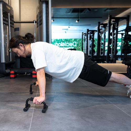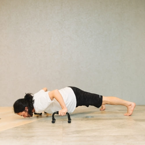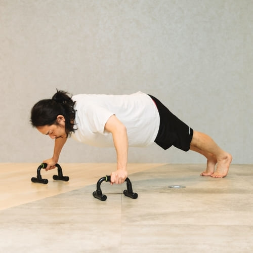 通常のプッシュアップだと手のひらを床につけておこなうが、プッシュアップバーを使用する場合、バーを握り込むことで手首の負担を軽減できる。