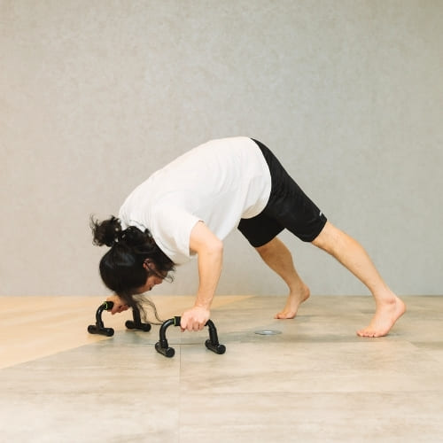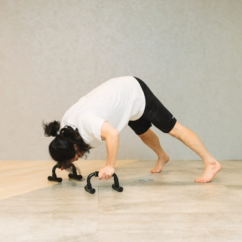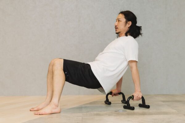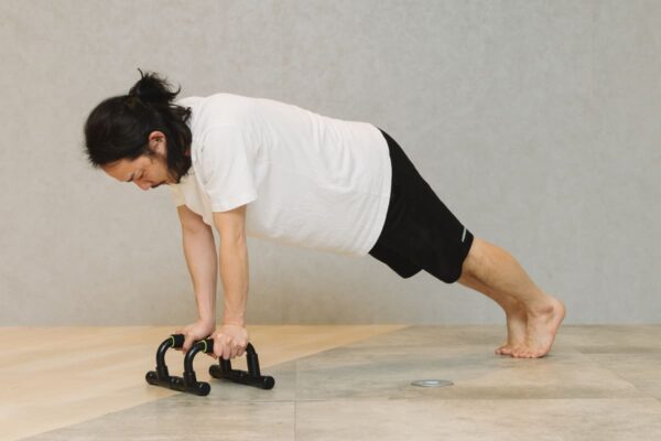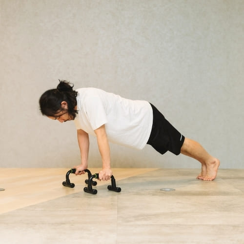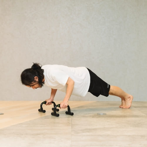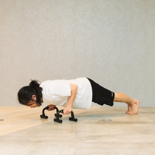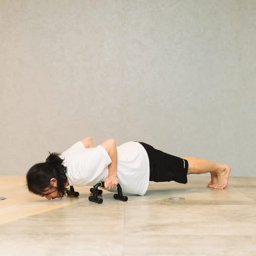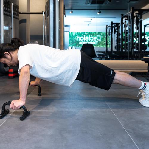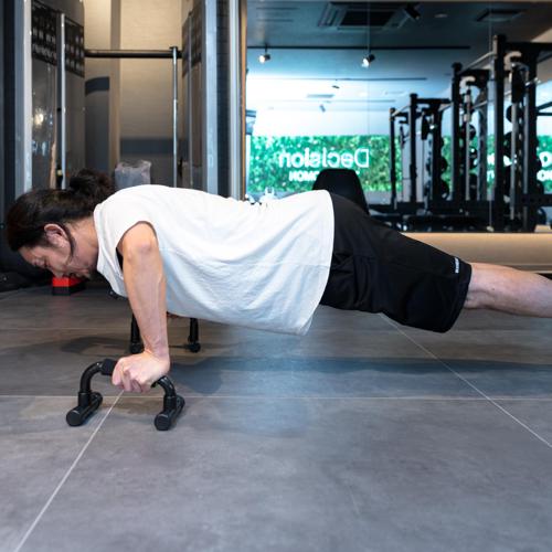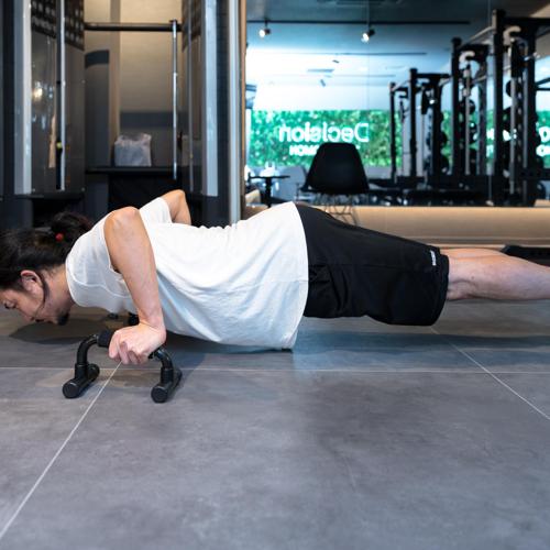 プッシュアップバーは可動域を広く取れることで負荷を高められるが、「胸を深く落とす」「腰を反らさない」「手の向きをハの字にする」など、使い方を工夫することで効果を最大化できる。