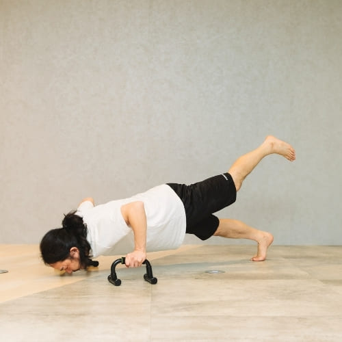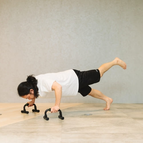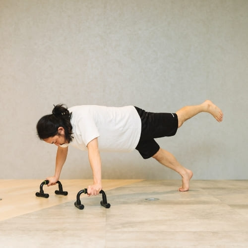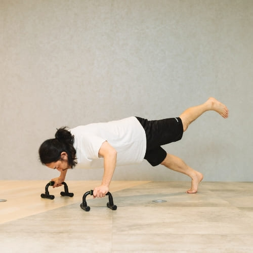 プッシュアップバーを使ってできないことはないですが、床でやったときと負荷はほとんど変わらないため、あえてプッシュアップバーでやる必要はなさそうです。