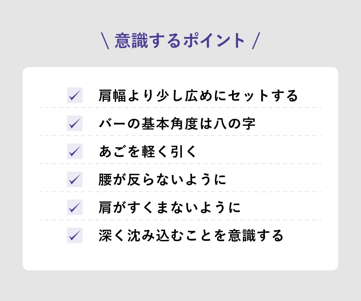- 肩幅より少し狭い位置でバーをセットする(八の字)