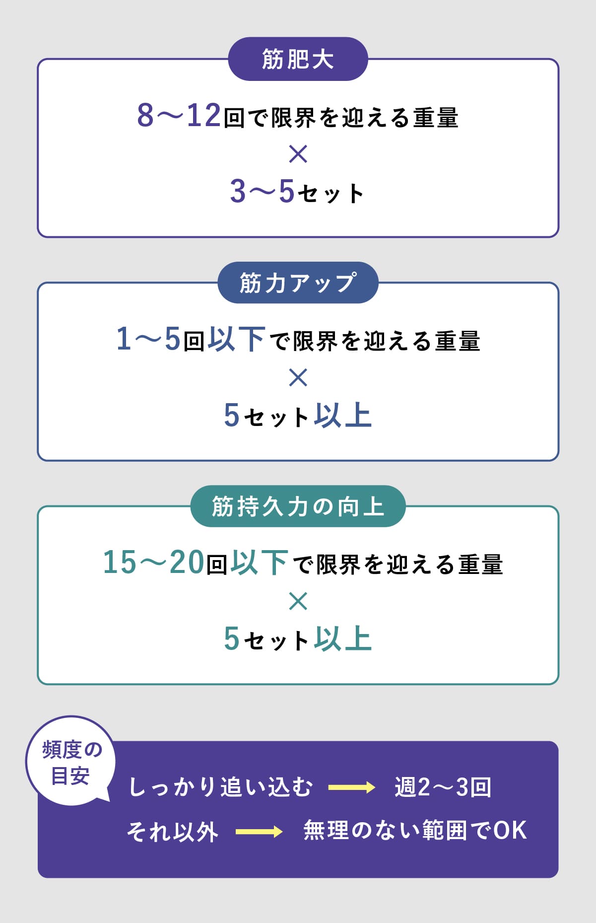 自身の目的に合わせた回数で限界を迎える負荷に合わせてトレーニングをおこなうことが大切。