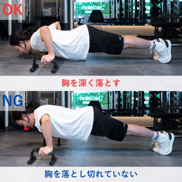 プッシュアップバーの最大のメリットが可動域を大きく取れることなので、それを活かせていない(深く胸を下ろせてない)場合は、あまり使っている意味がありません。