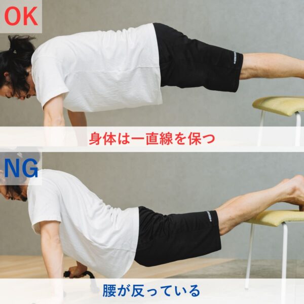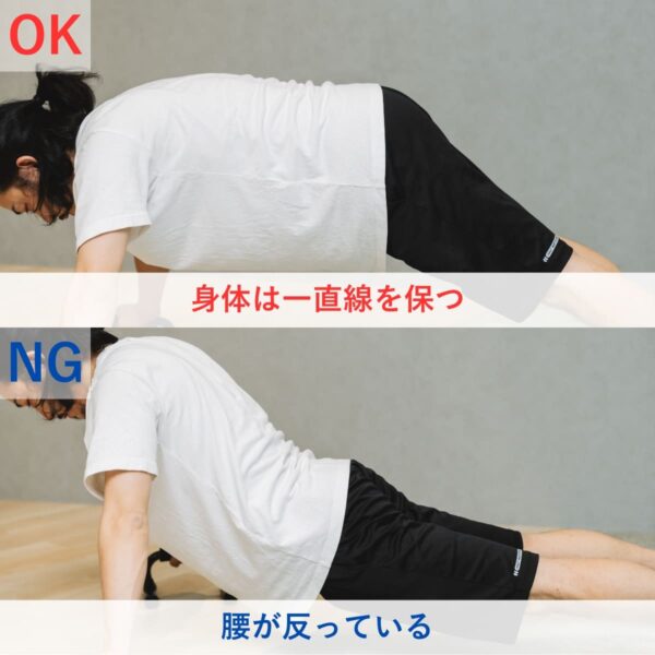 最初は体幹を維持できていても、回数を重ねて疲れてくると、腰が反ってしまうことが多かったです。