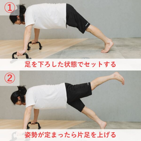 足を上げる系の種目は、足を上げながらポジションを決めるのではなく、普通に構えてポジションを整えてから足を上げるのが基本です。