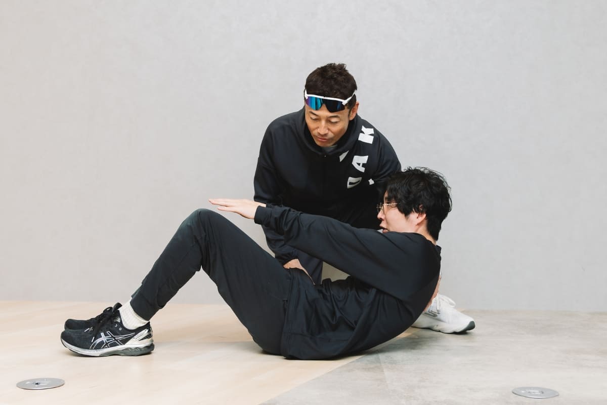 想像以上にお腹の力だけで上がるのが難しかったです。最初は足をかなり遠くにセットしてもいいので、いきおいをつけずに上がってくる練習から始めるのがよさそうです。