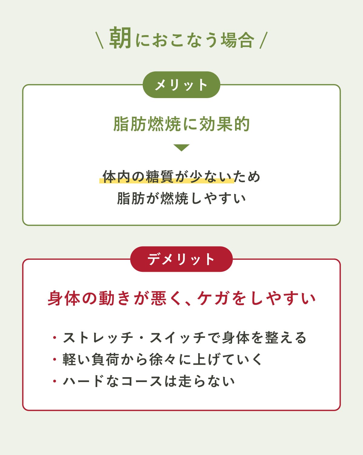 ただし、1時間以上の長時間は身体への負担が大きく、朝はケガしやすいため、無理のない範囲で続けることが重要。
