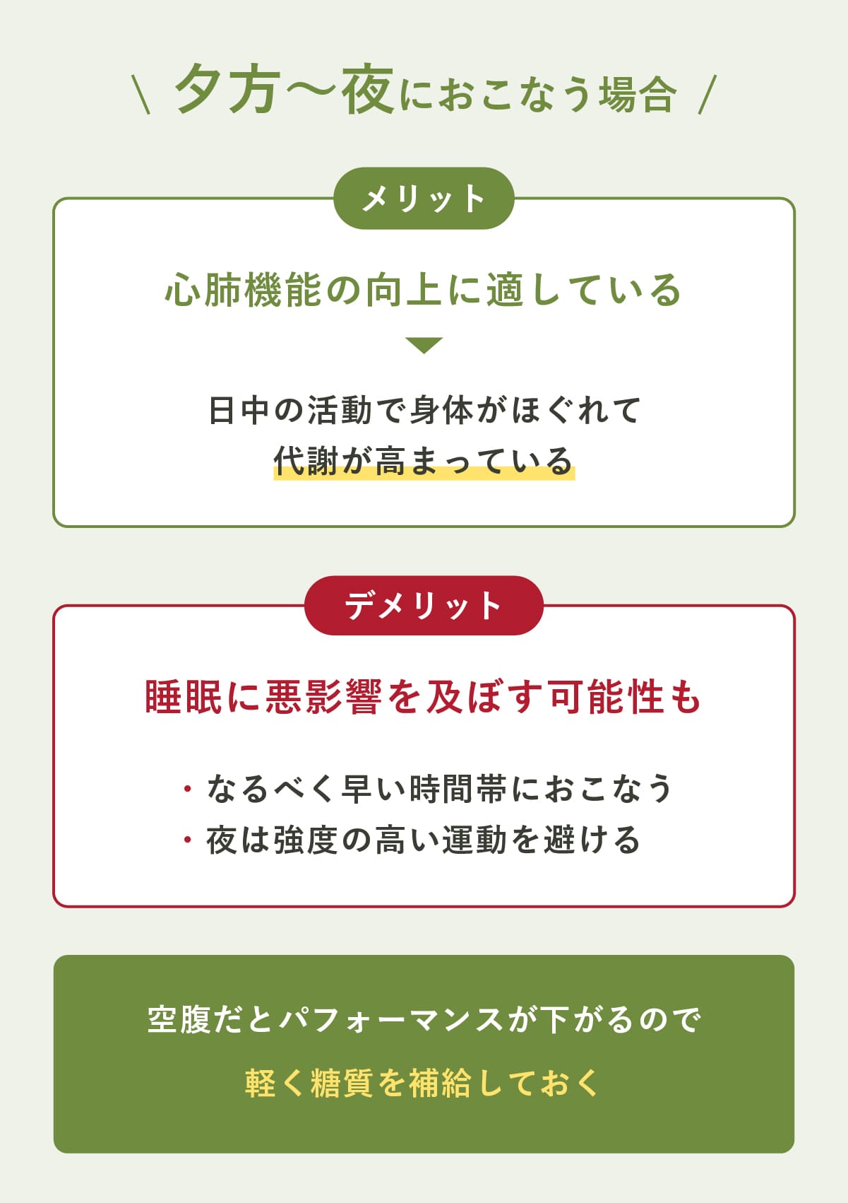 また、空腹だと運動のパフォーマンスが下がり、ケガのリスクも高まる。軽く糖質を補給して、空腹状態で運動をしないことも大切。