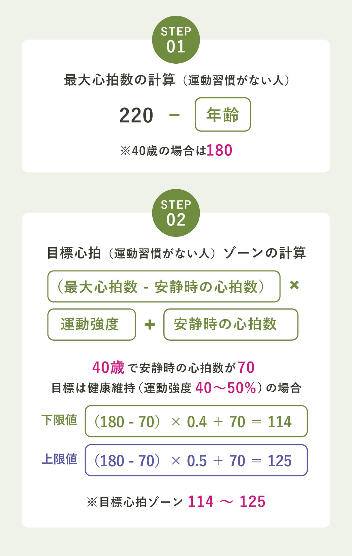 | 普段あまり運動をしていない | (最大心拍数(220-年齢)-安静時の心拍数) × 運動強度 + 安静時の心拍数 |