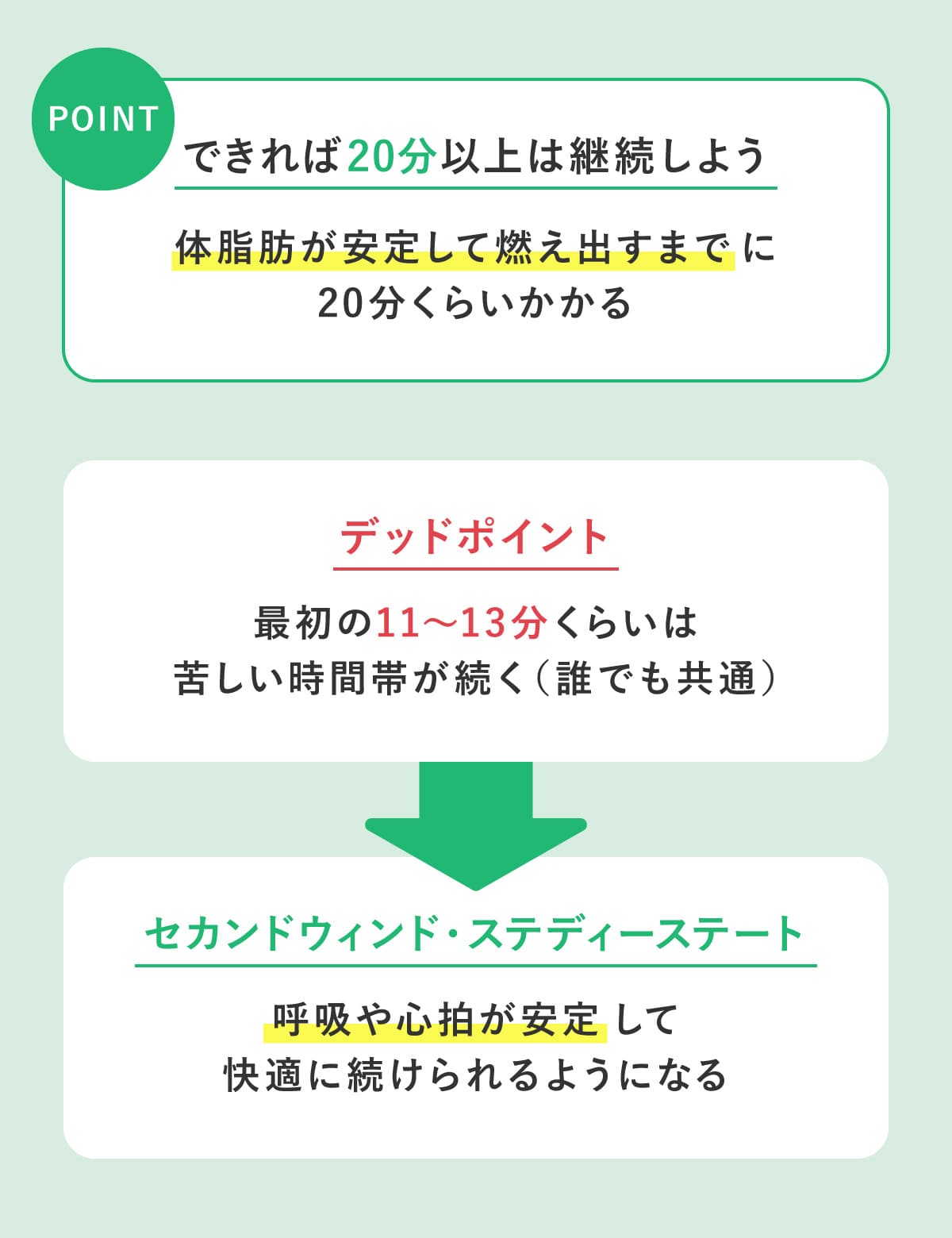 また、運動開始直後は負荷やペースに慣れていないため、最初の11〜13分くらいは苦しい(デッドポイント)が、ここを乗り越えると呼吸や心拍が安定して(セカンドウィンド)、楽に続けられるようになる(ステディーステート)。