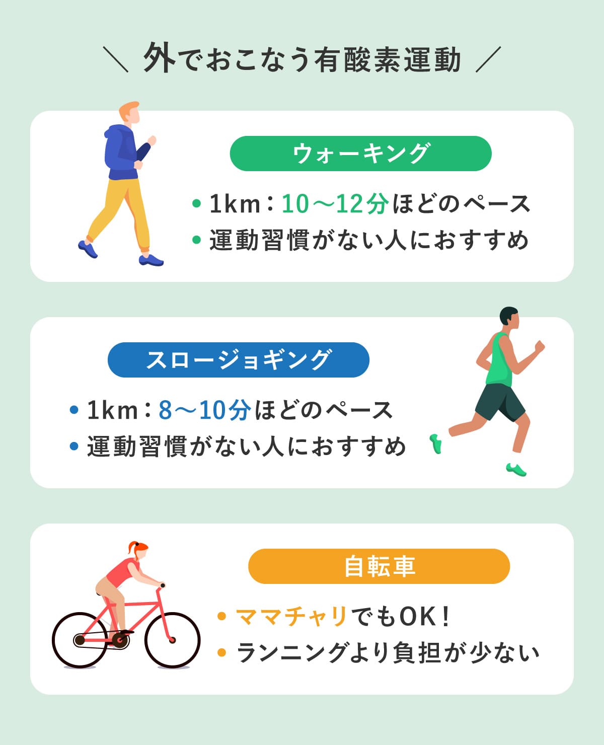 ウォーキング・ソロージョギング・自転車は外でおこなう有酸素運動として、毎日でも続けやすい。普段から運動をしていない人は、20分間早歩きをするだけでも、かなり運動になるので、無理のないレベルからスタートしてみよう。