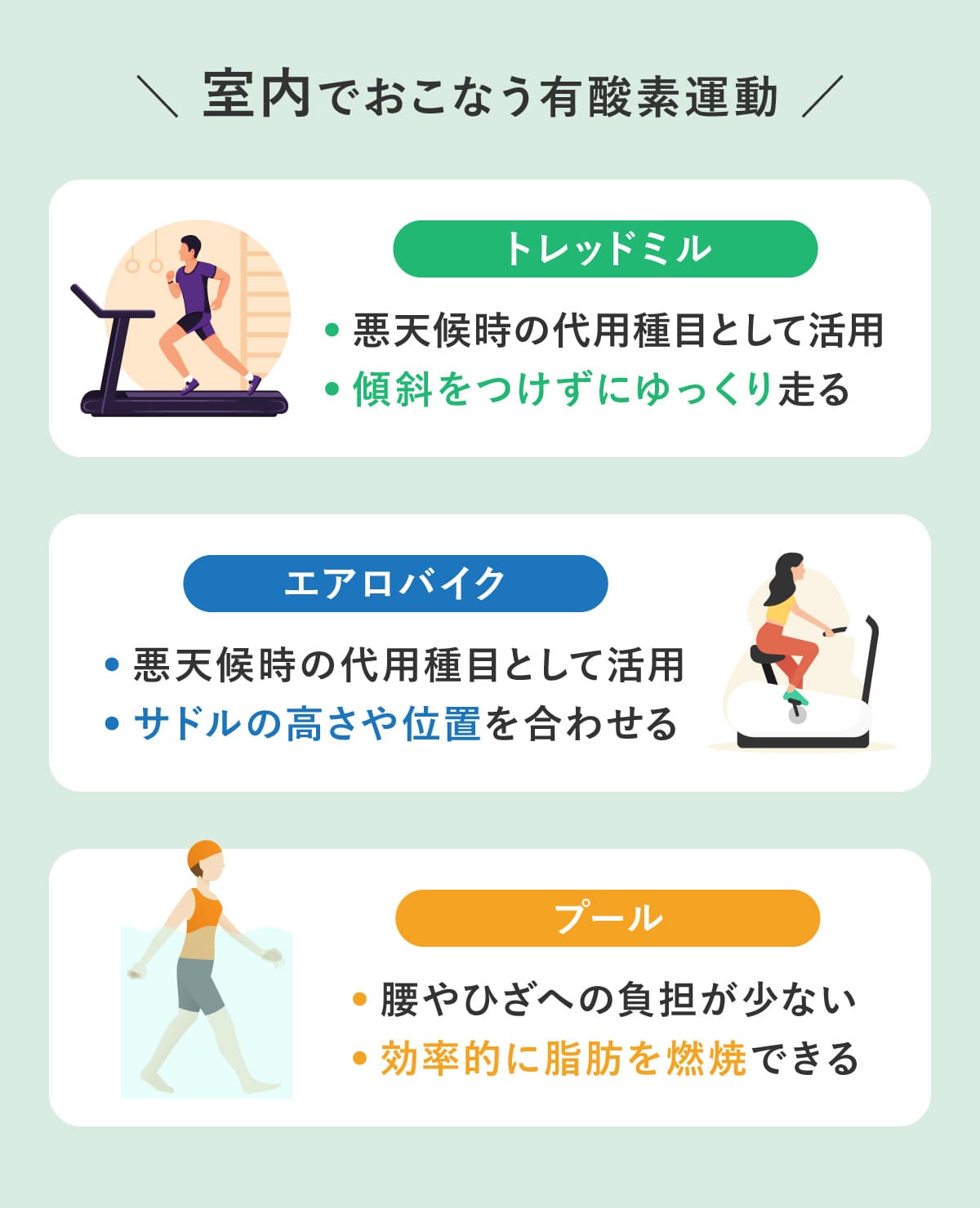 トレッドミルやエアロバイクはランニングやサイクリングとは別物として考え、外で運動をするのが難しい場合の代用種目として位置づけよう。
