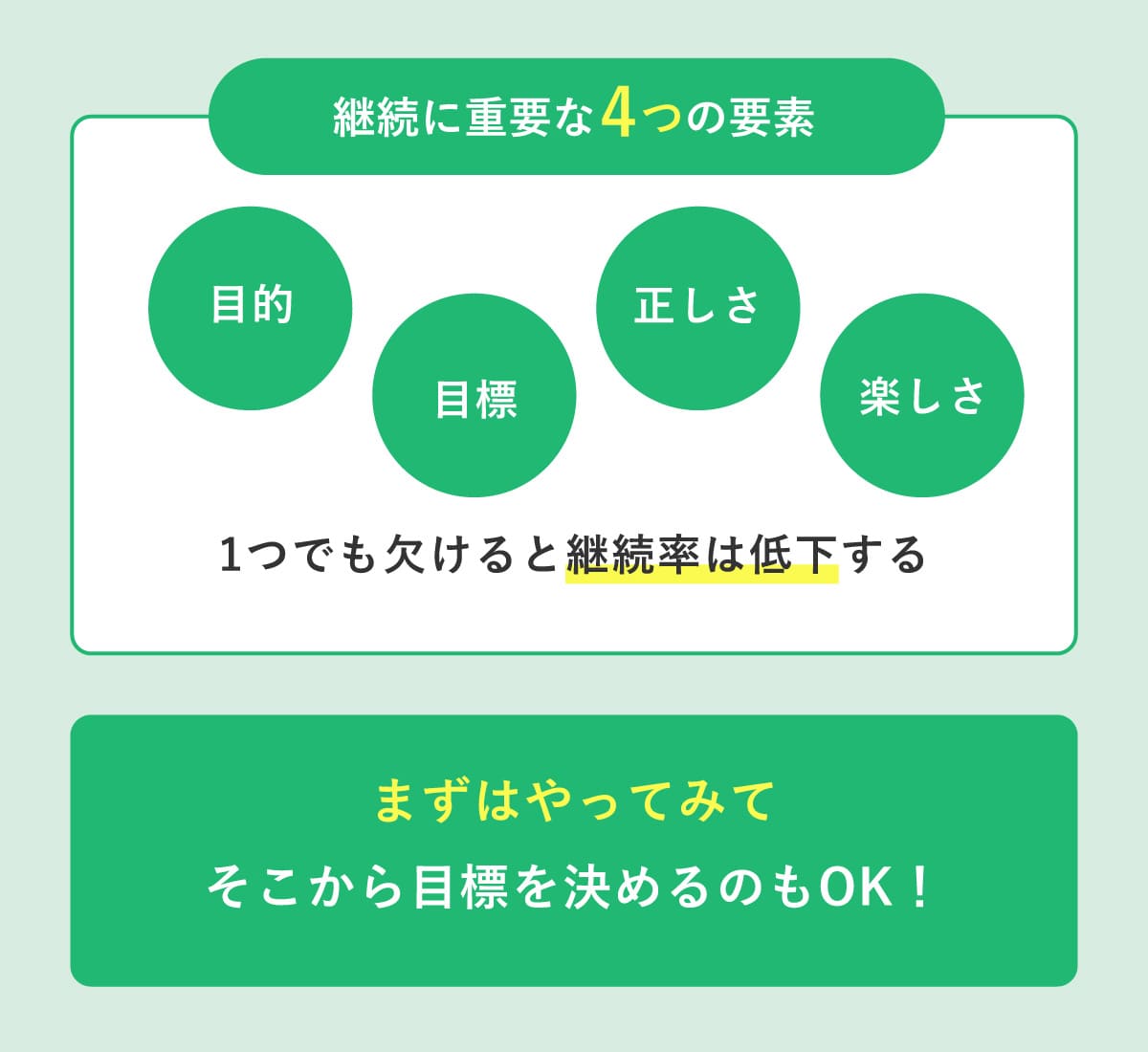 - 楽しさ:しんどい・苦しいだけでは長続きしない