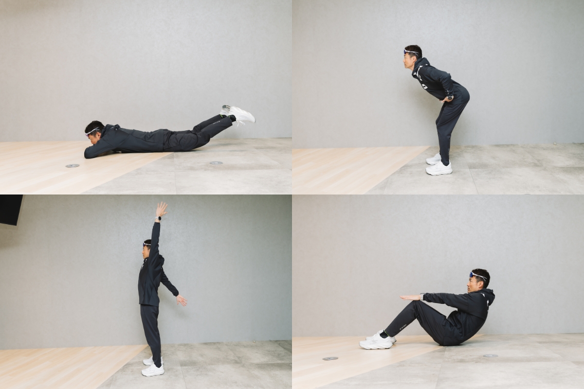 - 両足裏を地面につけたまま、お尻を上げて両手を前につく