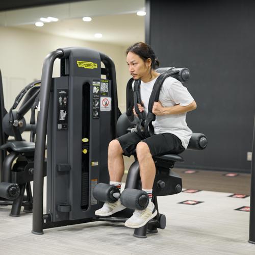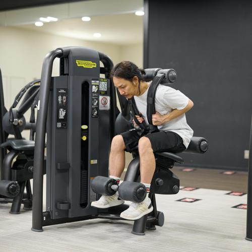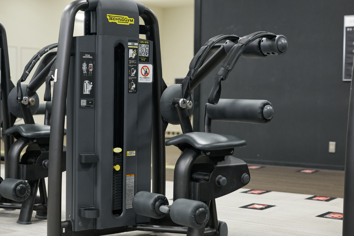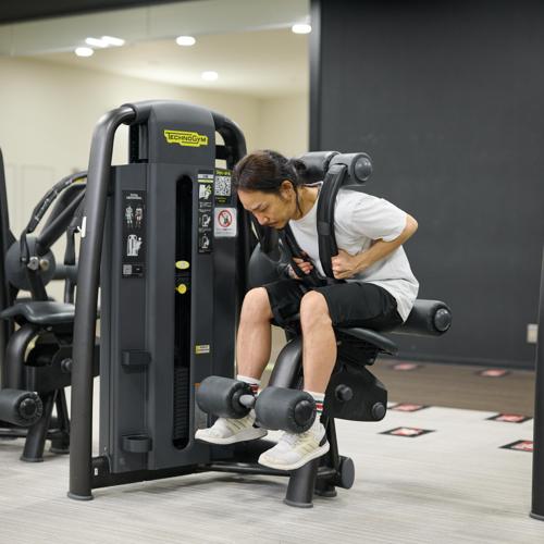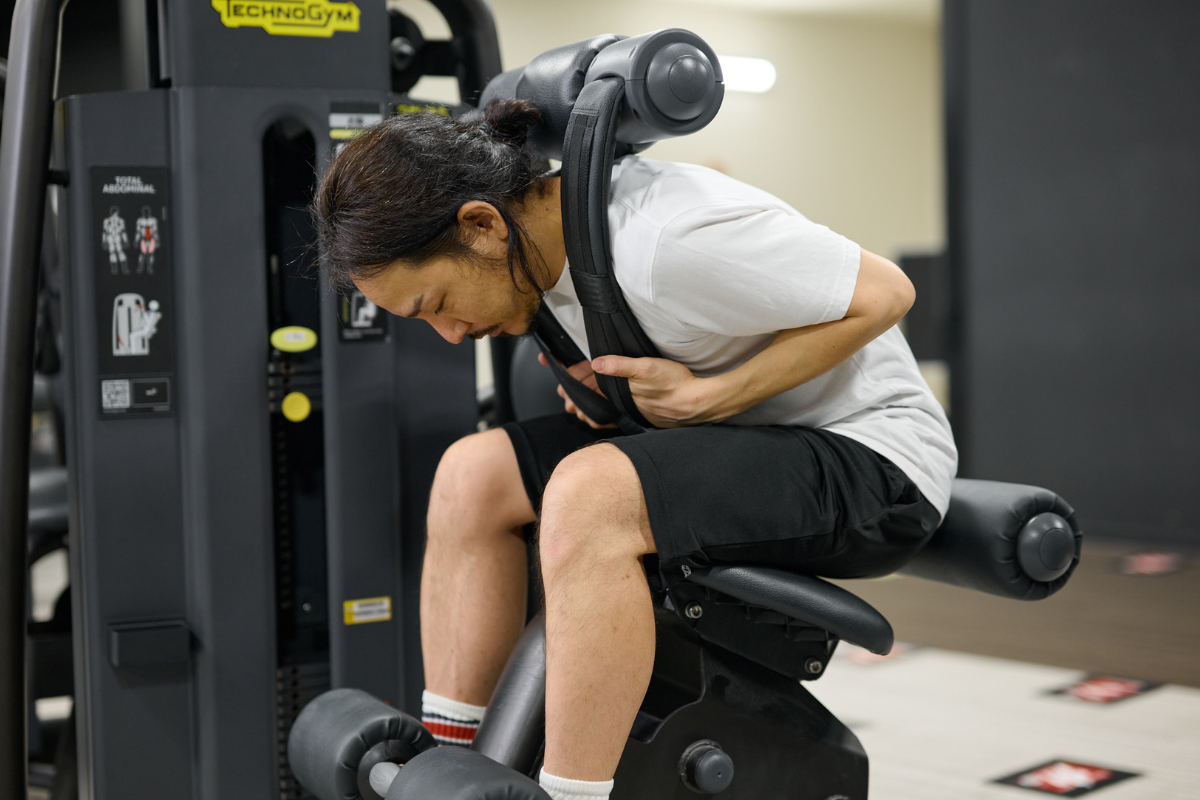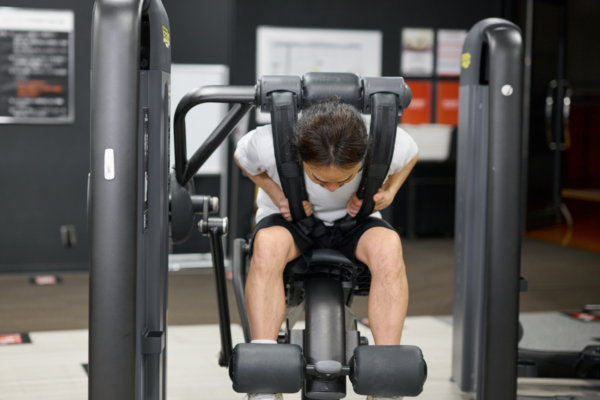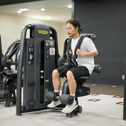 ジムに設置されているアブドミナルクランチマシンを使う。シートと重量プレートを調整することで、体格や筋力レベルに合わせた負荷設定が可能。動作軌道が固定されているため、腹直筋への刺激を意識しやすい。