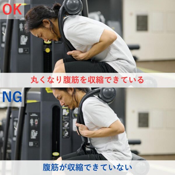 マシンでは「起こす動作」より「戻す動作」が雑になりやすいので、しっかり意識して行うのがポイントです。丸めた姿勢から動作を逆再生するイメージで最初の姿勢に正確に戻すことで、腰への負担を抑えながら腹筋への刺激を保ちやすくなります。