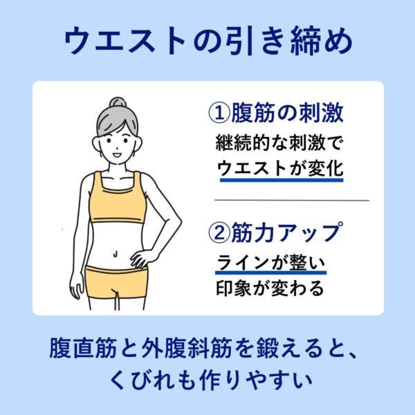 腹直筋を継続的に刺激することで、ウエスト周辺の引き締めを実感しやすい。サイズダウンというより、筋肉が入ることでラインが整い、見た目が変化しやすい点が特徴。体脂肪の減少と組み合わさることで、ウエストのメリハリが強調されやすくなる。