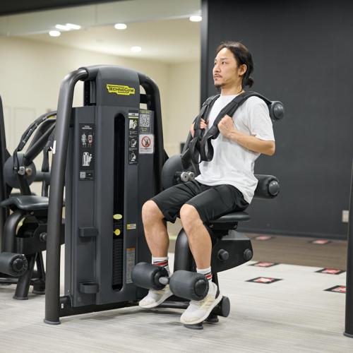 アブドミナルクランチマシンは、マシンの回転軸と自分の体の動かしたい位置を合わせることが大切です。体を折り曲げるポイントとマシンの回転軸が合う高さに座ることで、腹筋への刺激を感じやすくなります。