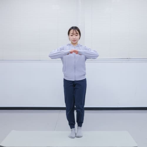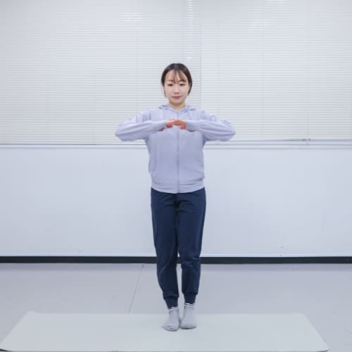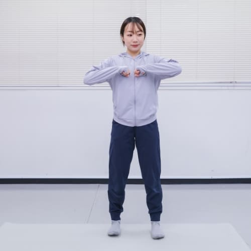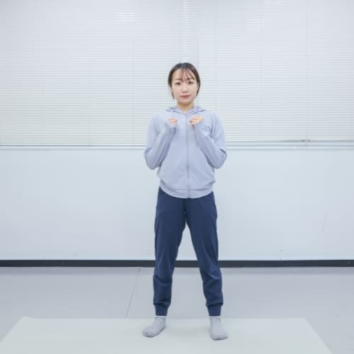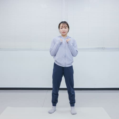 - 足を肩幅に開いて立ち、軽く拳を握って胸の前に構える